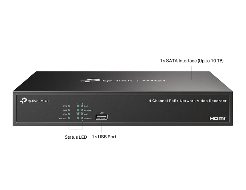TP-Link VIGI NVR1004H-4P to rejestrator IP obsługujący do 4 kanałów. Został zaprojektowany z myślą o wykorzystaniu z kamerami z serii VIGI, wspiera maksymalną rozdzielczość 8 Mpix. Ma wbudowany switch, posiada 4 porty fast Ethernet (10/100 Mb/s), na każdym z nich znajduje się wyjście zasilania PoE+. Maksymalna moc na port wynosi, w zależności od standardu, 15,4 W przy 802.3af lub 30 W przy 802.3at. Łączny budżet mocy na całe urządzenie to 53 W. Rejestrator korzysta z kompresji H.265+, która pozwala na znaczne ograniczenie rozmiaru zapisywanych nagrań. Posiada 1 złącze SATA, do którego możesz podłączyć dodatkowy dysk o maksymalnej pojemności 10 TB. Do komunikacji z siecią wykorzystuje 1 port fast Ethernet, maksymalna przepustowość (bitrate) wynosi 80 Mb/s na wejściu i 60 Mb/s na wyjściu. Zastosowano złącze HDMI, które możesz wykorzystać do odtwarzania obrazu o wysokiej jakości. Zarządzanie odbywa się z programu VIGI Security Manager, dostępna jest również aplikacja na urządzenia mobilne z systemem Android / iOS.