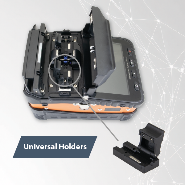 Urządzenie posiada uniwersalne holdery, które mogą służyć do spawania gołych włókien różnego rozmiaru i średnicy, pigtaili oraz kabli typu drop. Dodatkowo w zestawie znajduje się holder pozwalający spawać złącza typu SOC.