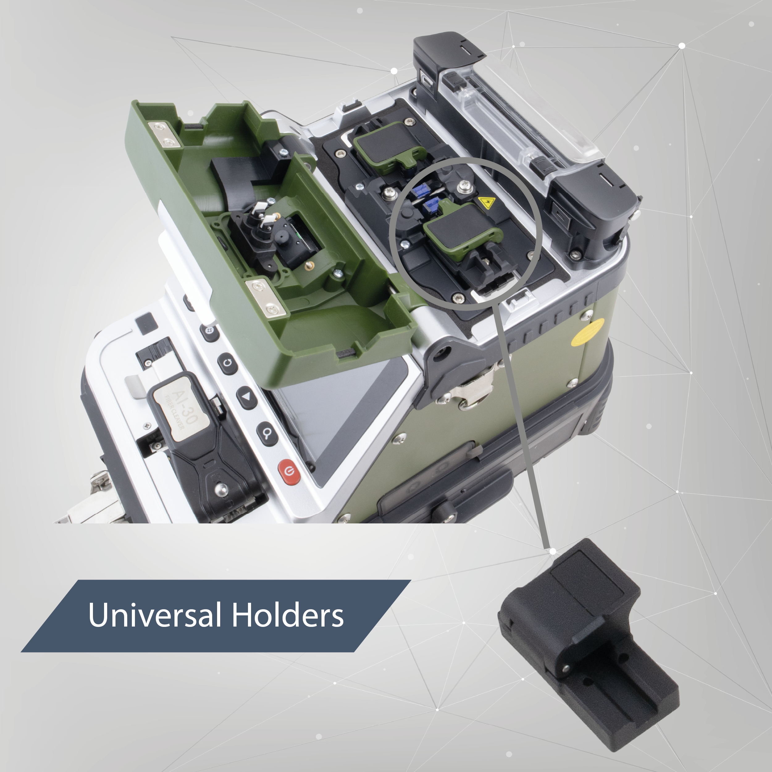 Urządzenie posiada uniwersalne holdery, które mogą służyć do spawania gołych włókien różnego rozmiaru i średnicy, pigtaili oraz kabli typu drop. Dodatkowo w zestawie znajduje się holder pozwalający spawać złącza typu SOC.