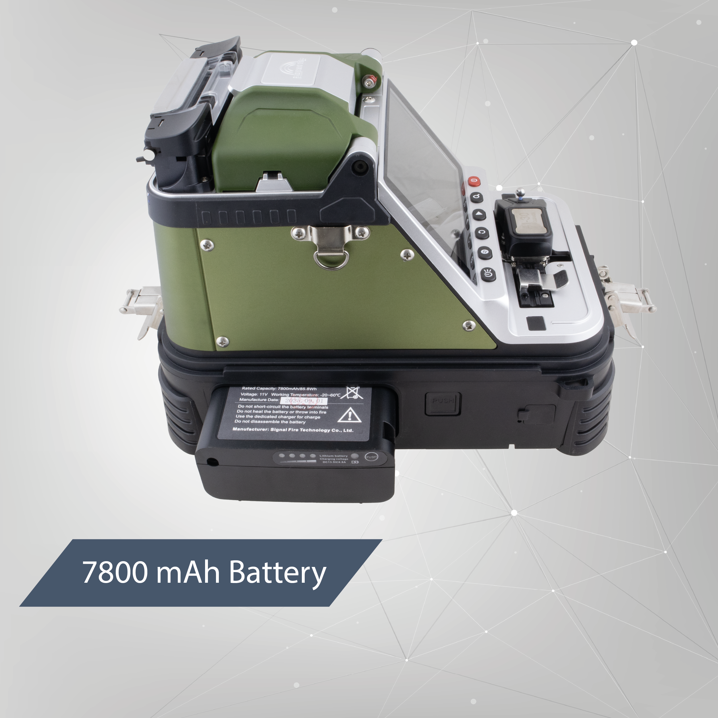 Oferowany produkt posiada zintegrowany nóż do cięcia włókien światłowodowych. Dzięki temu po ucięciu włókna możesz od razu, krótkim ruchem umieścić je w holderze. Dodatkowy atut stanowią wbudowany miernik mocy optycznej i wizualny lokalizator uszkodzeń. Miernik pozwala zmierzyć moc transmitowaną na danym odcinku, wspiera pomiar fal o długości 850, 1300, 1310, 1490, 1550 i 1625 nm. Wizualny lokalizator pozwoli ci sprawdzić uszkodzenia włókna na krótkim odcinku (moc 15 mW). W zestawie znajdziesz niezbędne akcesoria: akumulator 7800 mAh z ładowarką, dodatkowe elektrody, zaawansowany stripper, pędzelek oraz dozownik do alkoholu. Wszystko zamknięte zostało w poręcznej walizce, do której opcjonalnie możesz przypiąć pasek.