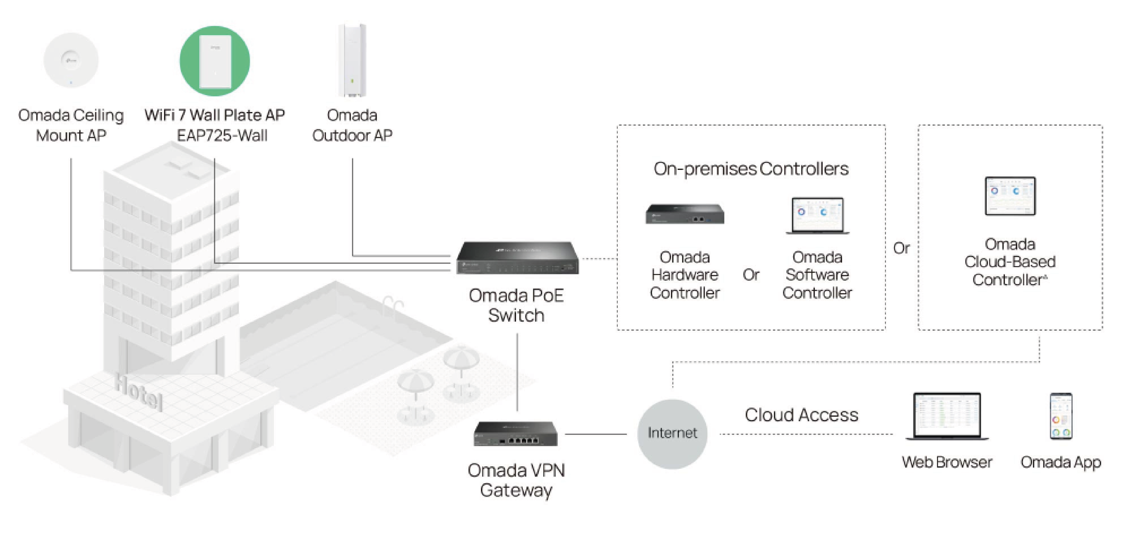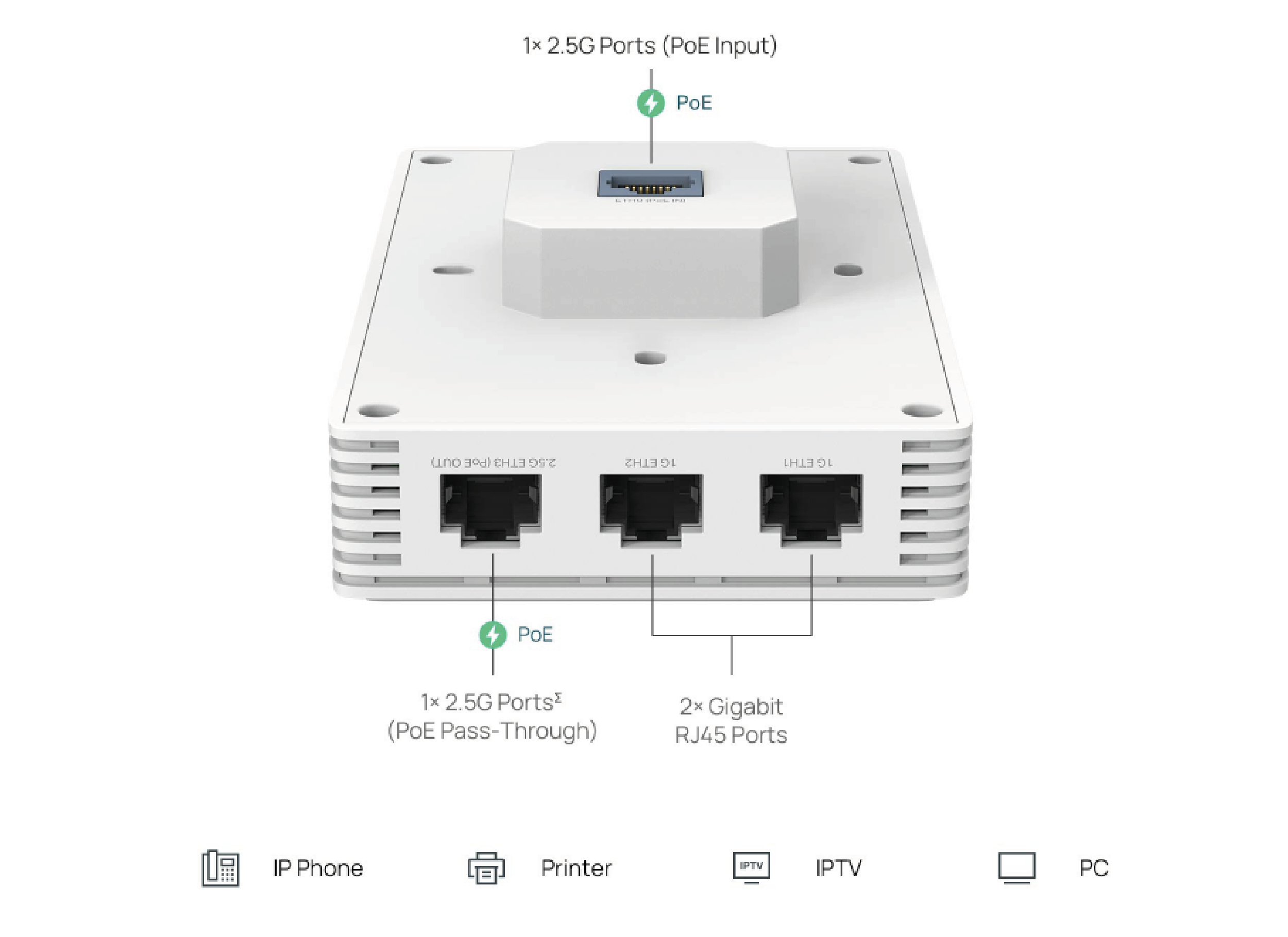 Kompaktowa konstrukcja naścienna sprawia, że EAP725-Wall idealnie sprawdzi się w pokojach hotelowych, biurach i obiektach mieszkalnych, umożliwiając estetyczną integrację z otoczeniem. Urządzenie wyposażono w port 2.5G Ethernet z PoE (802.3at), co zapewnia elastyczność wdrożenia oraz stabilne zasilanie i transmisję danych. Dodatkowe porty LAN umożliwiają podłączanie urządzeń przewodowych, takich jak komputery czy telewizory. EAP725-Wall może działać samodzielnie lub być elementem większej infrastruktury zarządzanej przez platformę Omada SDN, która oferuje centralne zarządzanie w chmurze, inteligentne równoważenie obciążenia, bezproblemowy roaming oraz pełną kontrolę nad konfiguracją sieci.