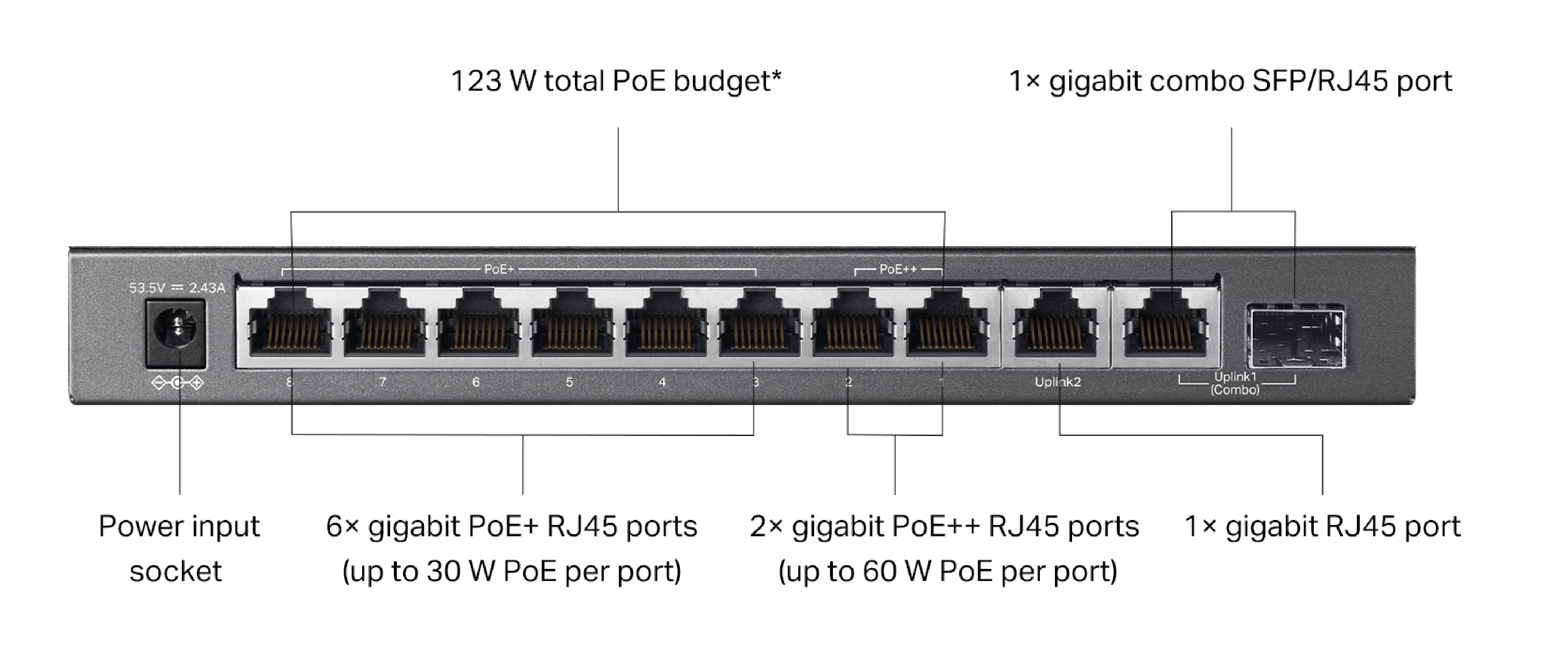 Łączna moc zasilania PoE: 123 W