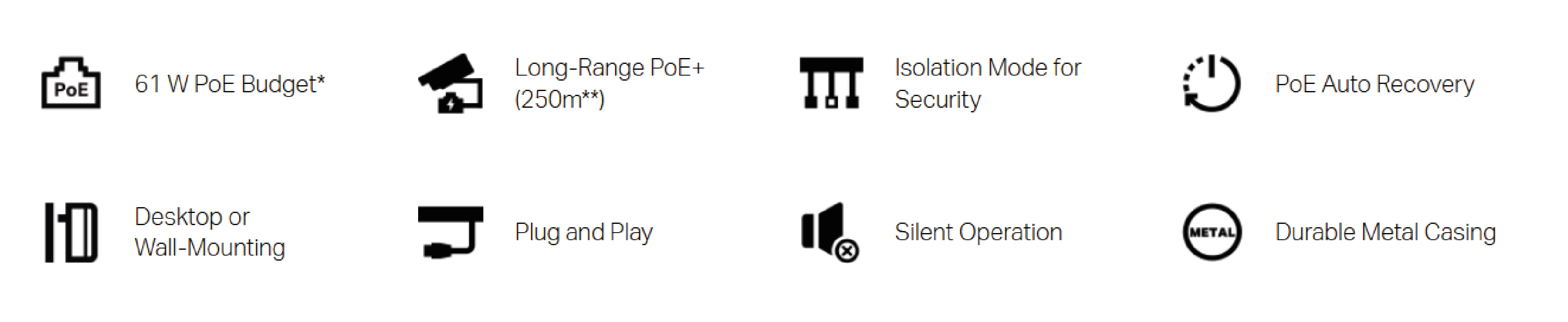 Funkcje zaawansowane | Tryb Extend (Porty 1-4, do 250m transmisji zasilania PoE i danych) Tryb Isolation (Porty 1-8) PoE Auto Recovery (Porty 1-8) Zgodność z urządzeniami PoE IEEE 802.3af/at Automatyczna nauka i wygaszanie adresów MAC Kontrola przepływu IEEE 802.3x 802.1p/DSCP QoS IGMP Snooping Technologia Green |