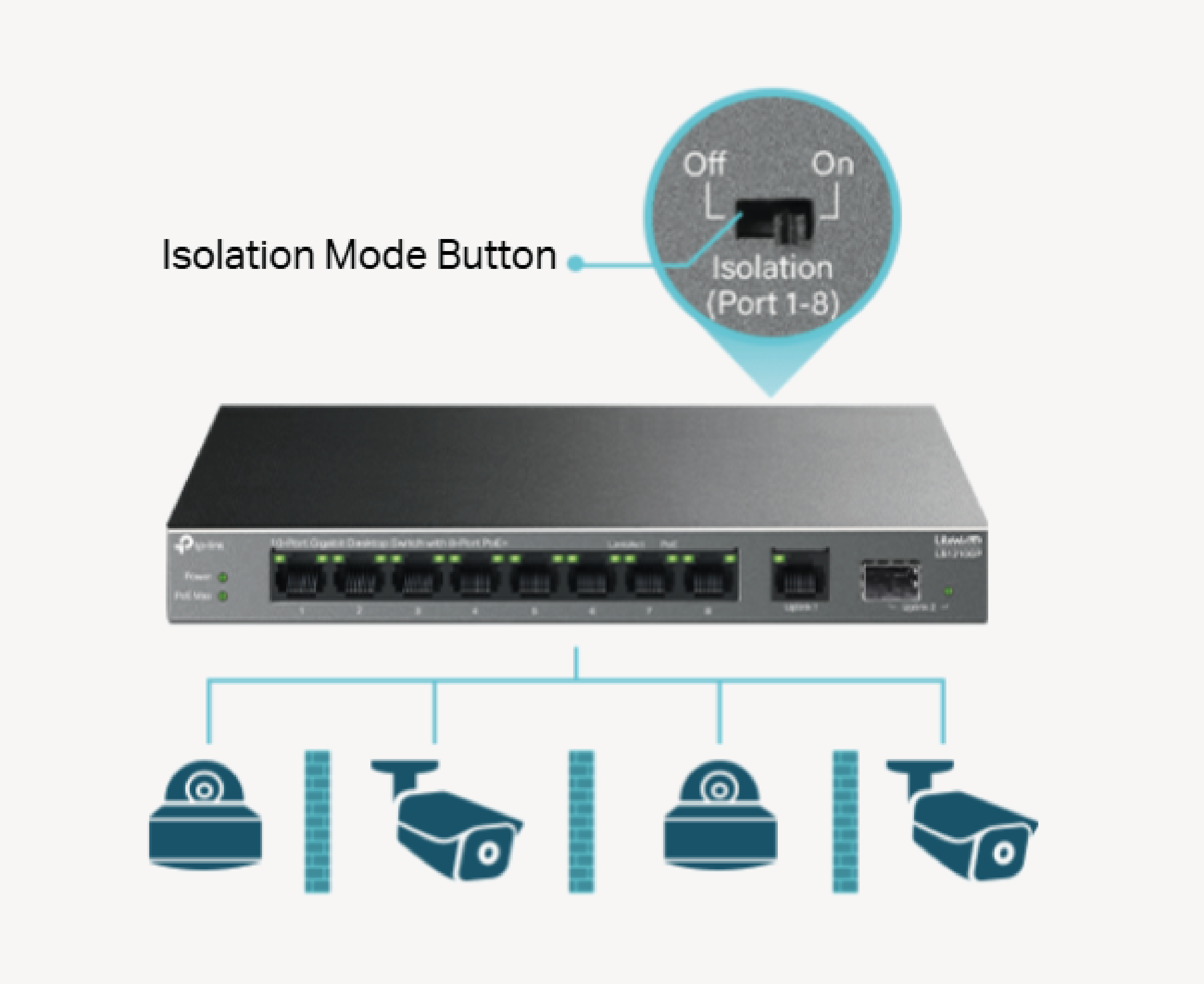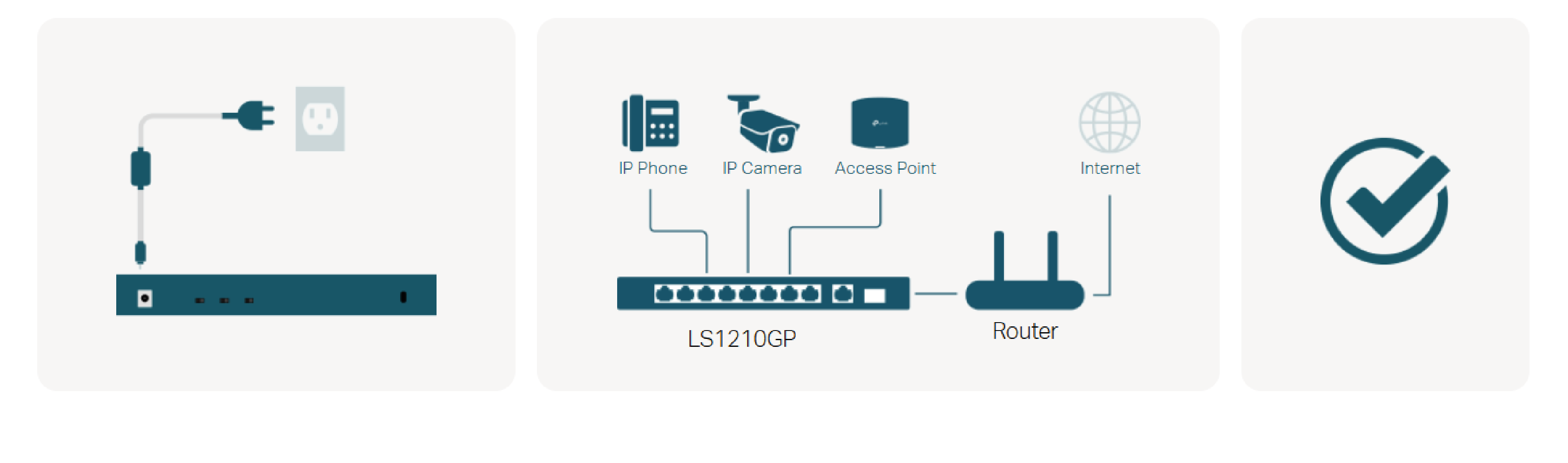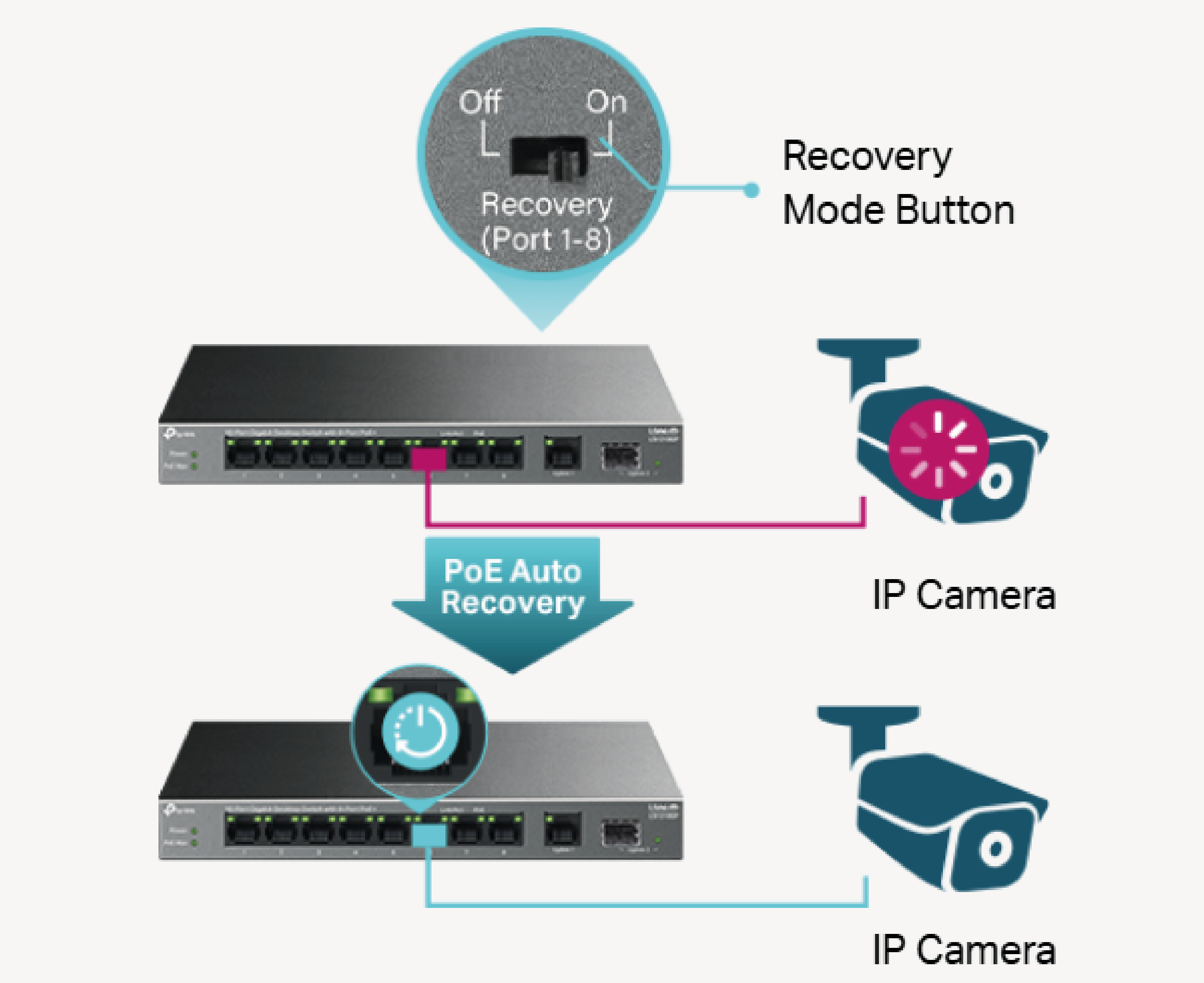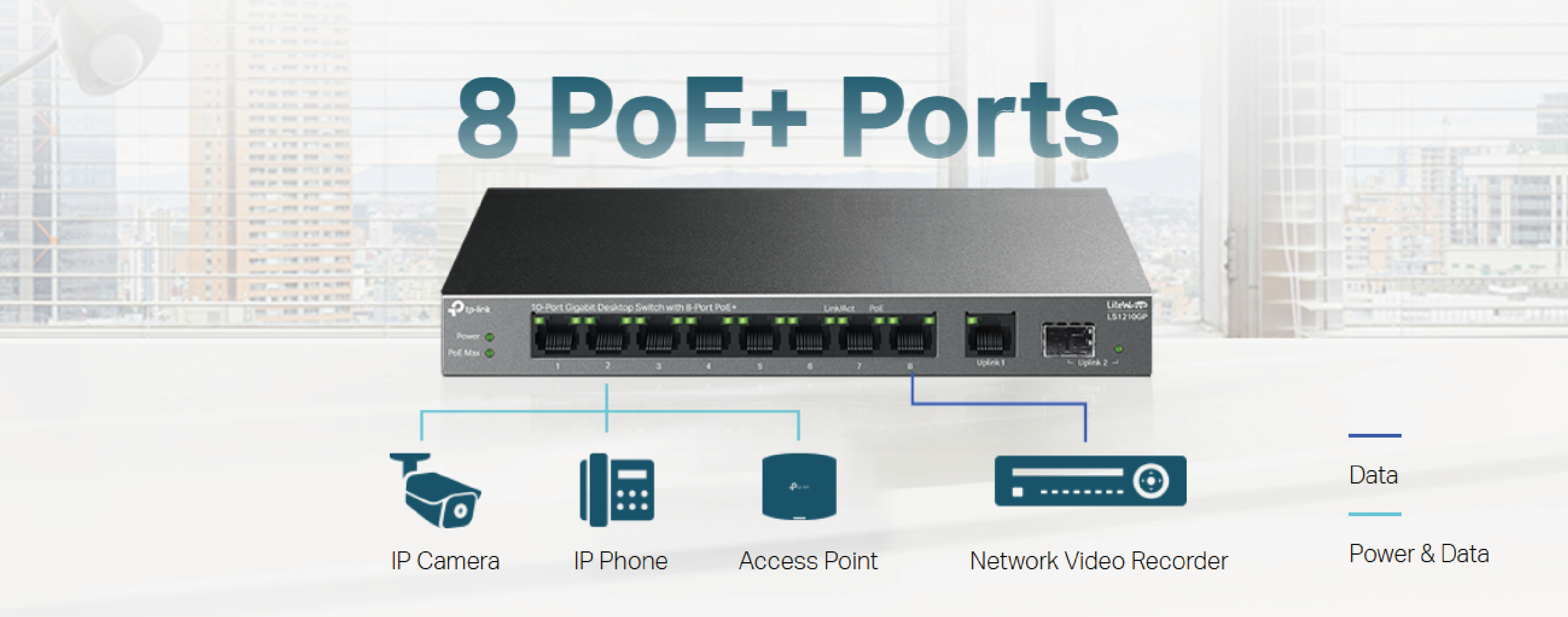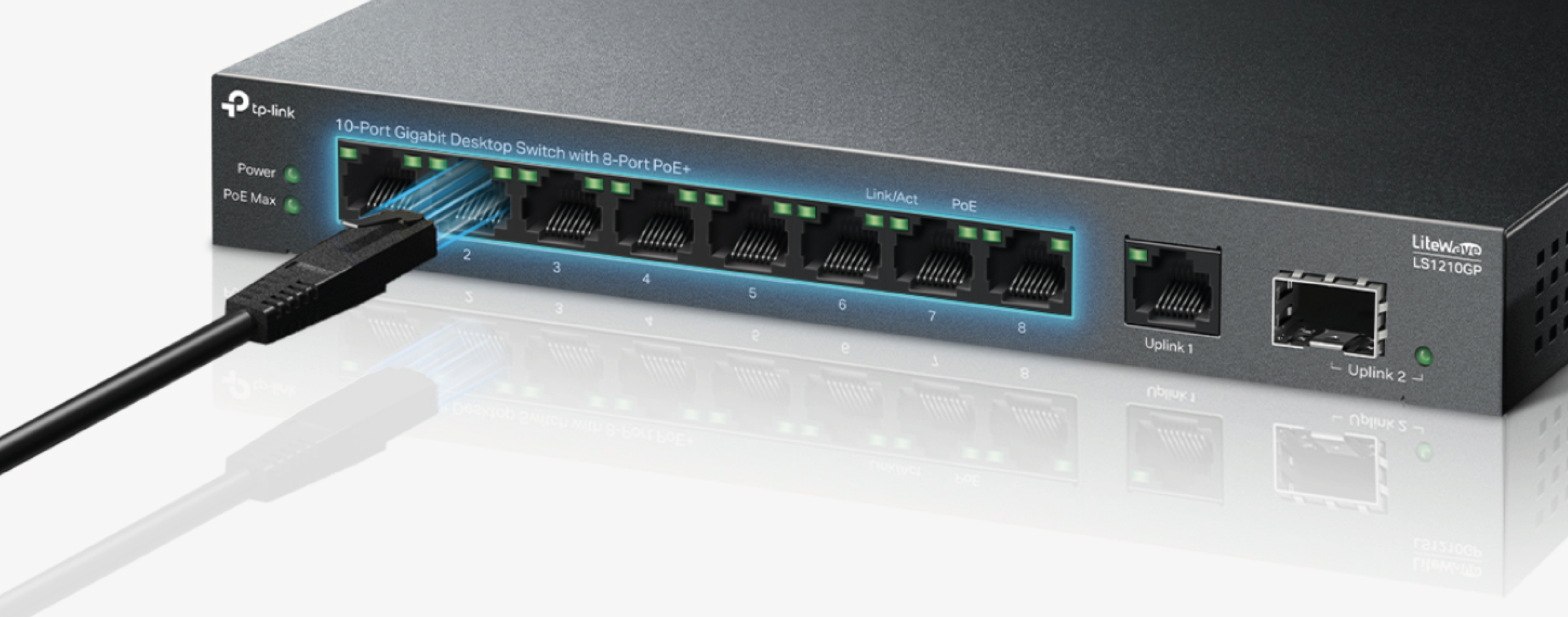 Przełącznik TL-SG1210PP zgodny ze standardami PoE IEEE 802.3af/at/bt, oferuje łączne zasilanie PoE do 123W (do 30W na portach PoE+ i do 60W na portach PoE++). Gdy przekroczona zostanie całkowita moc 123W, wtedy funkcja inteligentnego zarządzania energią wyłączy zasilanie portów o niższym priorytecie, aby uchronić urządzenia przed uszkodzeniami.