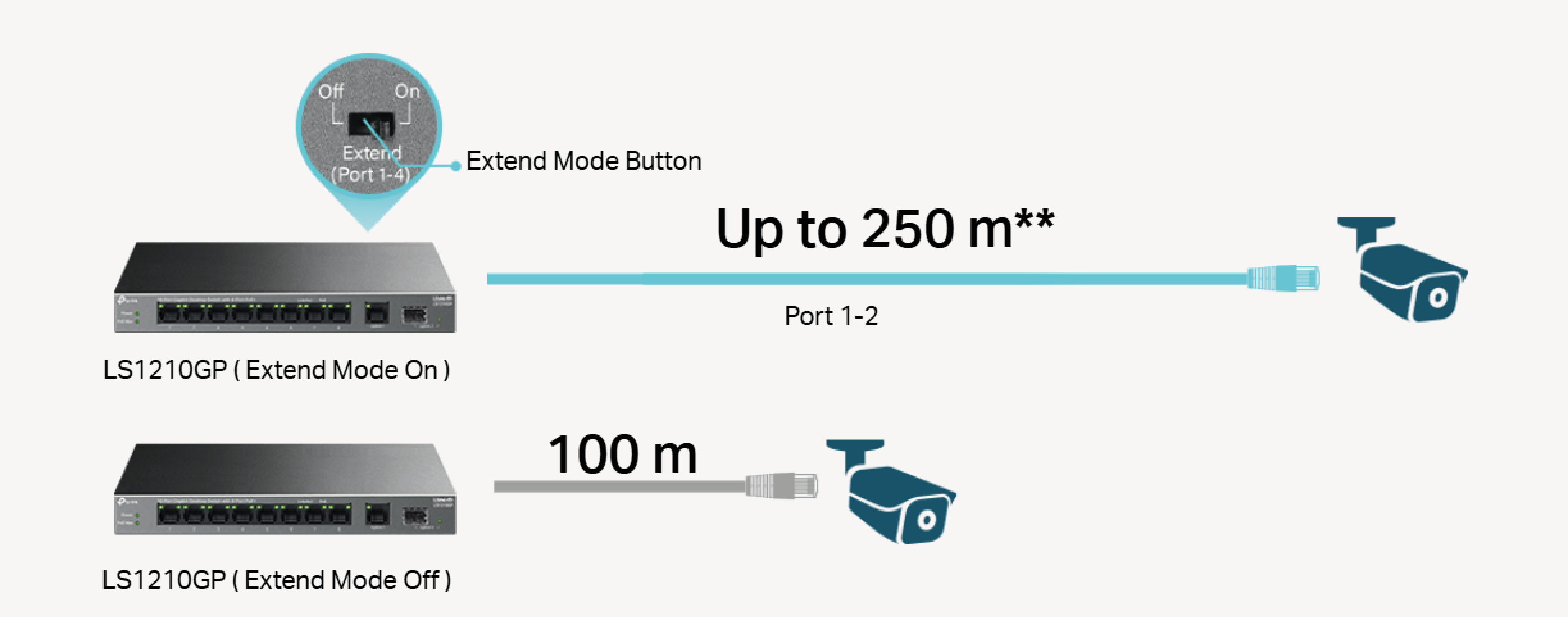 TP-Link TL-SG1210PP to niezarządzalny przełącznik wyposażony w łącznie 10 portów Gigabit Ethernet (10/100/1000 Mb/s), zapewniając szybką i stabilną łączność dla wszystkich podłączonych urządzeń. Switch oferuje zasilanie w standardzie PoE+ (802.3 af/at) na 6 portach Ethernet oraz zasilanie w standardzie PoE++ (802.3 af/at/bt) na pozostałych 2 portach Gigabit Ethernet, co pozwala na obsługę szerokiej gamy urządzeń, w tym nowoczesnych punktów dostępowych Wi-Fi 6 i kamer PTZ. Maksymalna moc wyjściowa na port wynosi 15,4 W korzystając z 802.3 af, 30 W korzystając z 802.3 at lub 60 W korzystając z 802.3 bt. Łączny budżet mocy na całe urządzenie to 123 W. TL-SG1210PP jest przełącznikiem typu Plug and Play i nie posiada funkcji zarządzania, ale oferuje dwa tryby pracy przełączane fizycznym suwakiem. W trybie "Extend" zasięg zasilania PoE zostaje zwiększony do 250 metrów, choć kosztem ograniczenia przepustowości do 10 Mb/s, natomiast tryb "Priority" zapewnia priorytet portom o najwyższej numeracji w celu ochrony przed przeciążeniem budżetu PoE. Urządzenie posiada pasywne chłodzenie i metalową obudowę typu desktop. Switch możesz postawić na biurku lub półce albo zamontować na ścianie, korzystając z dołączonego zestawu.