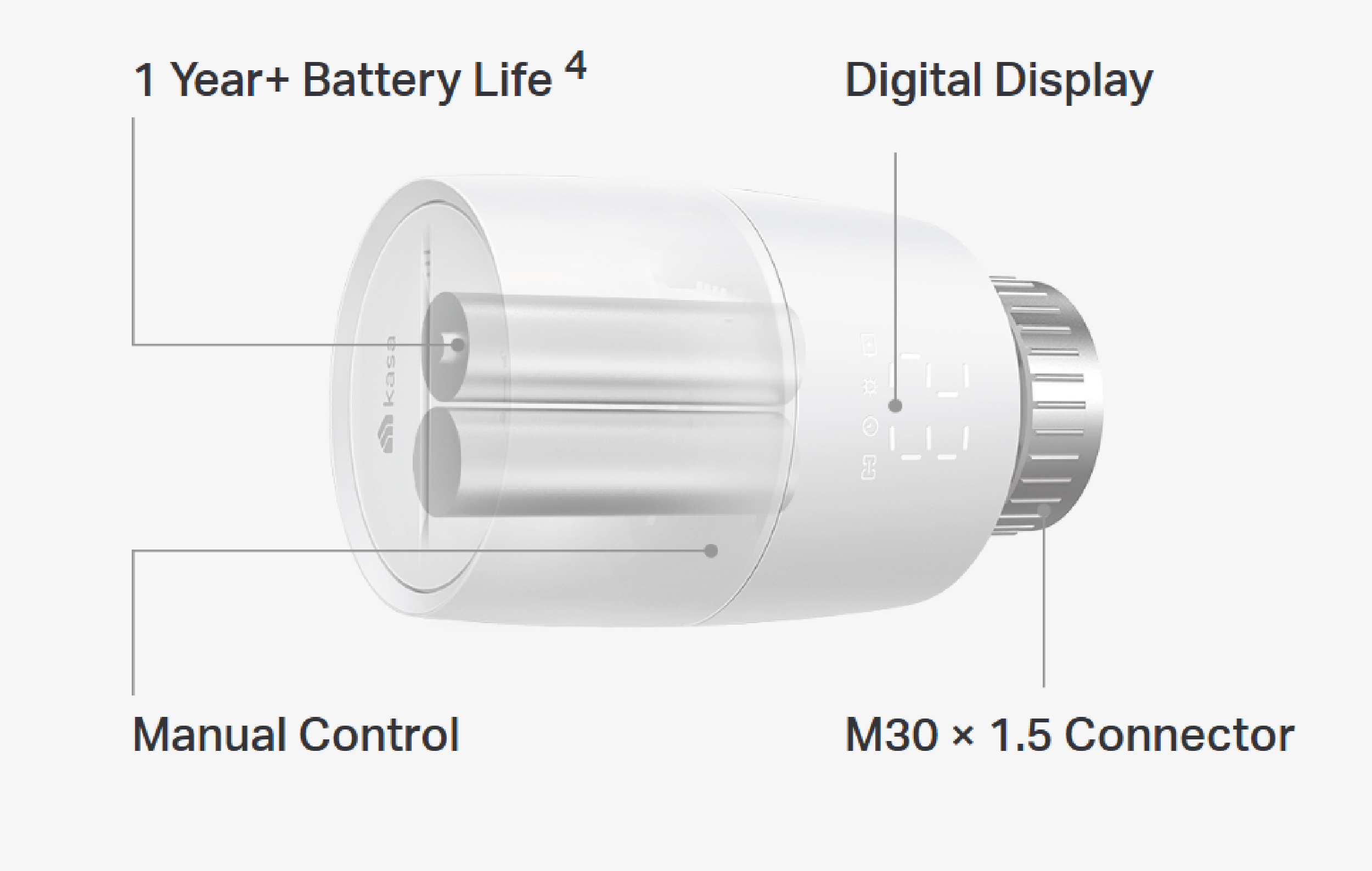 TP-Link Kasa Smart KE100 to Termostatyczny Zawór Grzejnikowy, przeznaczony do kontroli zaworu grzejnikowego. Urządzenie komunikuje się bezprzewodowo z Hubem Kasa Smart (wymaganym do działania, sprzedawanym oddzielnie lub w zestawie z Hubem). Użytkownik może kontrolować zawór i temperaturę za pomocą aplikacji mobilnej Kasa Smart (dostępnej na systemy Android / iOS) z dowolnego miejsca i w dowolnym momencie. Termostat jest kompatybilny z asystentami głosowymi, takimi jak Asystent Google i Alexa, umożliwiając kontrolę za pomocą komend głosowych. Aplikacja mobilna pozwala na tworzenie spersonalizowanych harmonogramów pracy termostatu oraz wprowadzanie prostych reguł automatyzacji. W zestawie znajdują się adaptery montażowe, zapewniające kompatybilność z większością standardowych zaworów grzejnikowych na rynku.