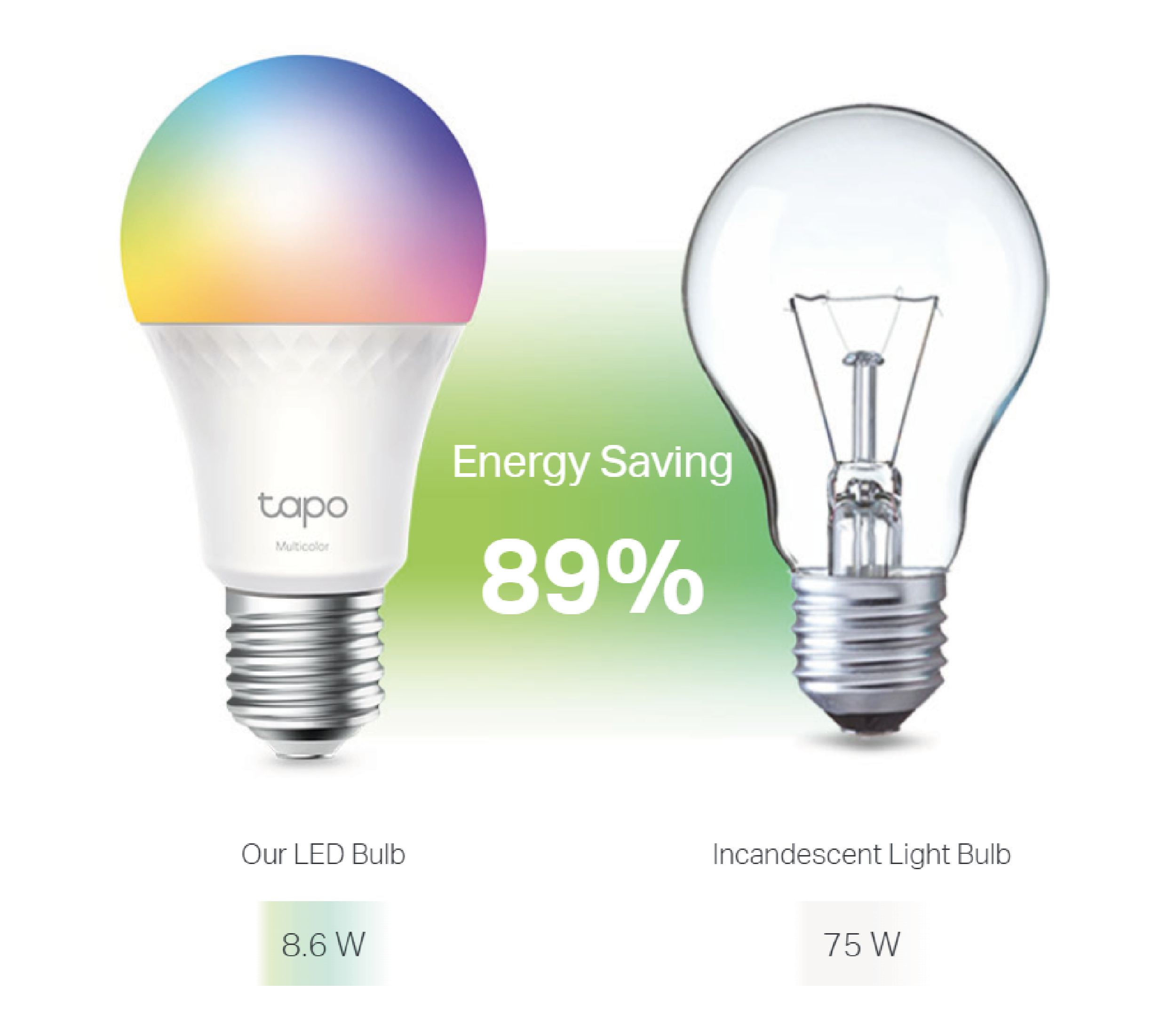 Tapo L535E zużywa nawet o 89% mniej energii w porównaniu ze żarówką o mocy 75W, zachowując tę samą jasność. Ta żarówka została zaprojektowana tak, aby mogła wydajnie pracować przez długie okresy czasu i jednocześnie być oszczędną.