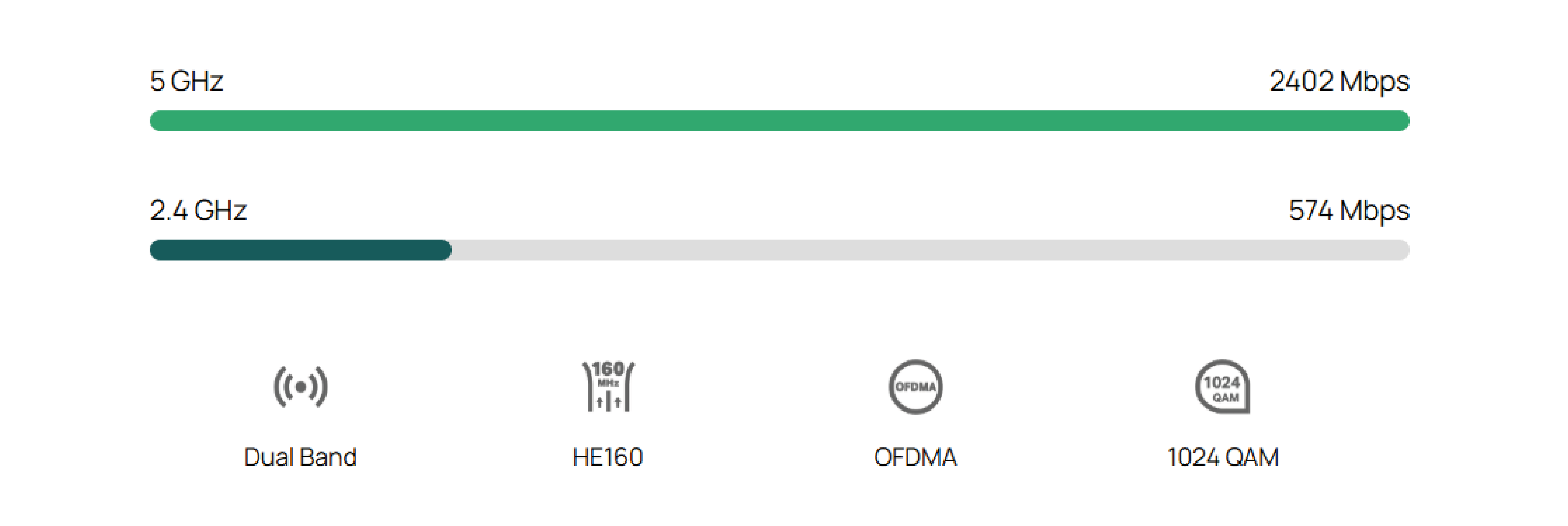 Częstotliwość Wi-Fi i Szybkość transferu | 2,4 GHz: 574 Mb/s 5 GHz: 2402 Mb/s (HE160) |