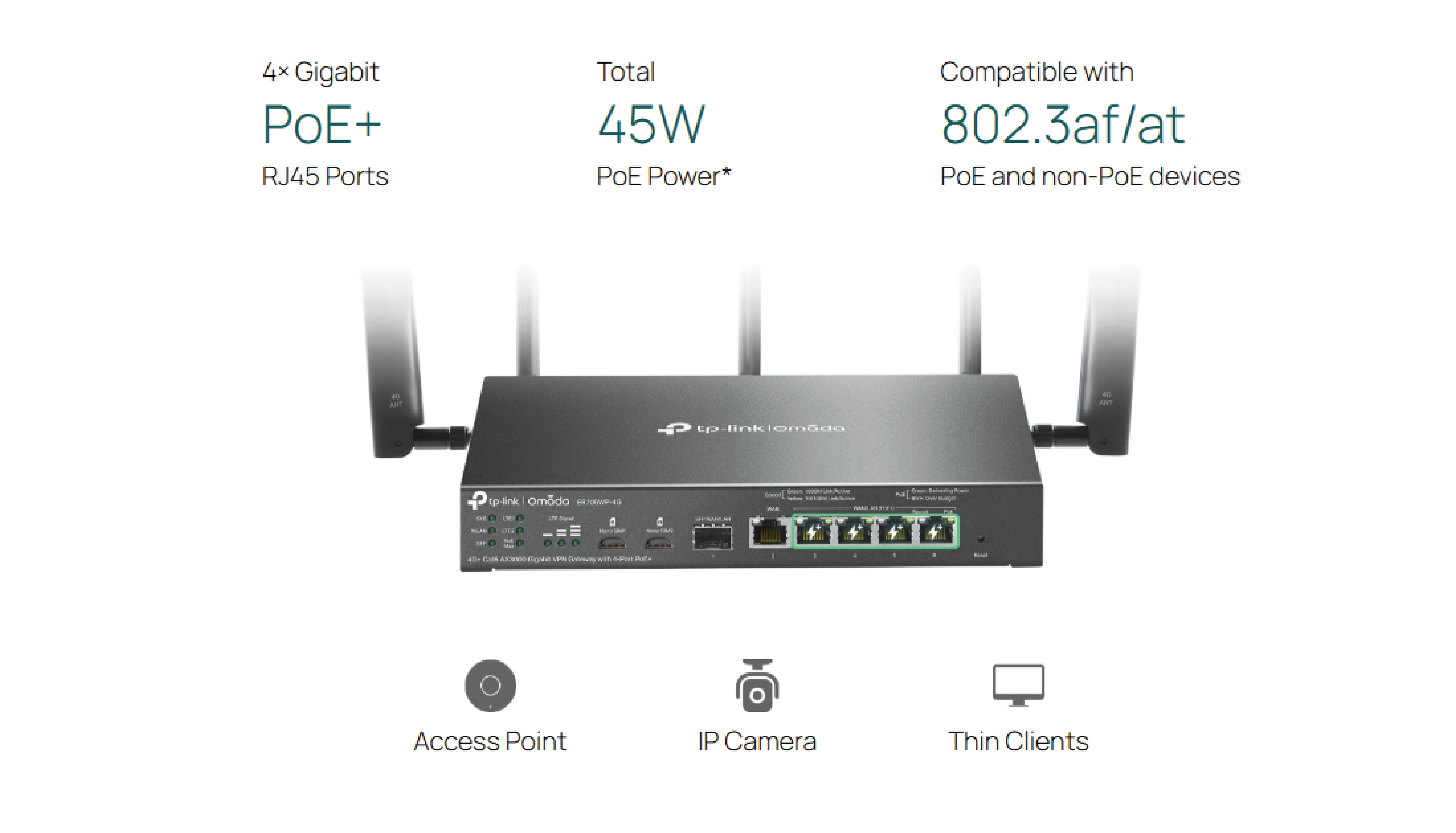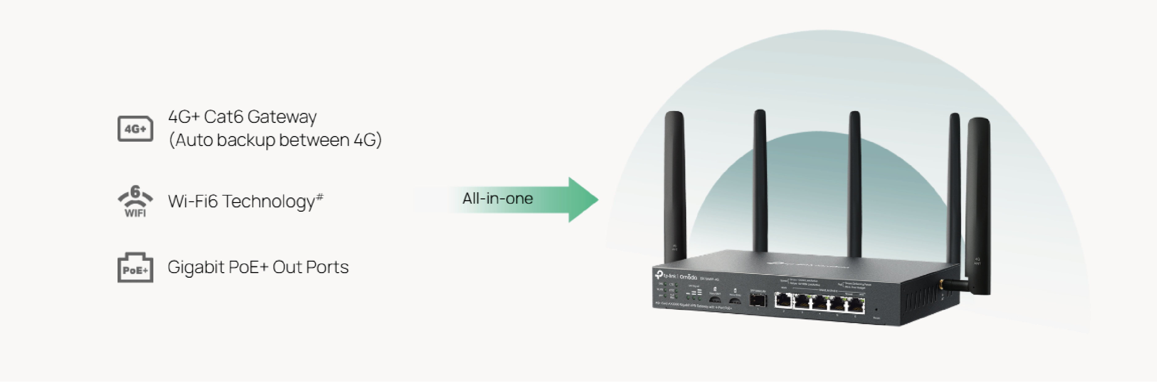 ER706WP-4G łączy w sobie dostęp do internetu 4G, technologię Wi-Fi 6 i 4 gigabitowe porty PoE+.