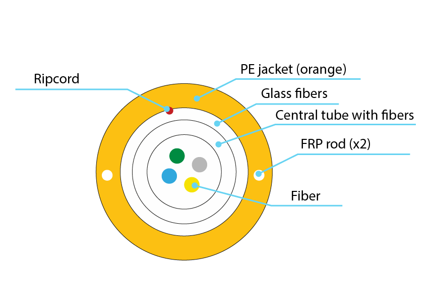 Kabel posiada jedną, centralnie umieszczoną tubę wewnątrz której znajdują się dwa włókna optyczne. Produkt został wzmocniony dwoma prętami FRP, dodatkowo cała konstrukcja jest wzmocniona obwodowo włóknem szklanym. Kabel wyróżnia się bardzo dużą odpornością na zgniatanie - do 4 kN, dzięki czemu jest odporny na nacisk, który występuje podczas montażu bezpośrednio w gruncie.