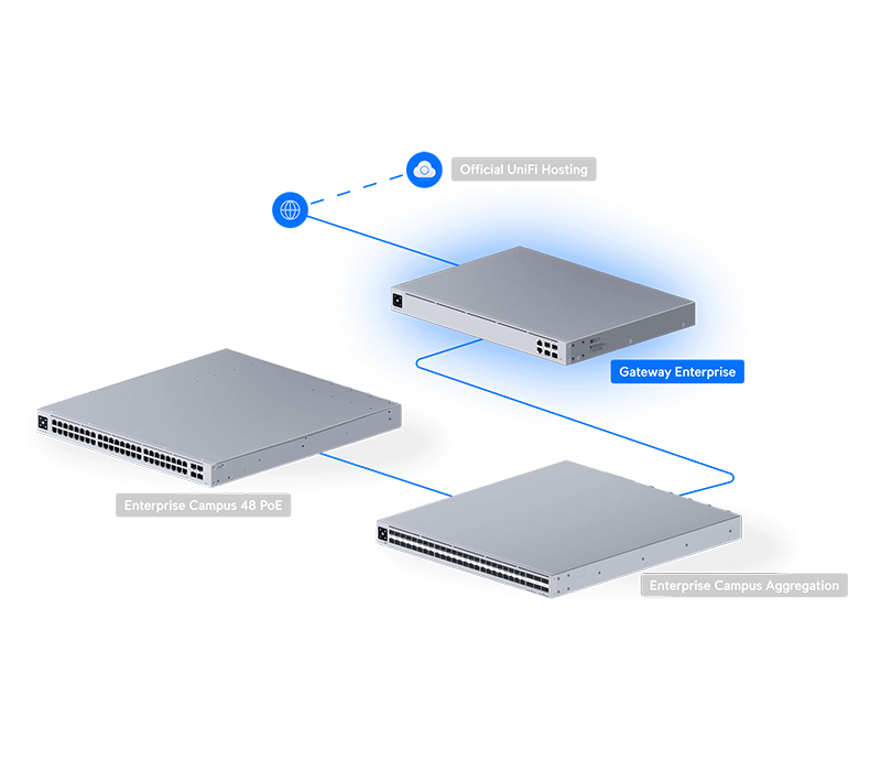 Dzięki bardzo dużej wydajności i niezawodności Gateway Enterprise doskonale sprawdzi się jako główny router w dużych, rozbudowanych sieciach opartych na systemie UniFi Network. Jest w stanie obsłużyć bardzo wielu użytkowników jednocześnie, również w przypadku skomplikowanych konfiguracji. Co więcej, pozwoli ci zbudować infrastrukturę w oparciu o przepustowość 25 / 10 Gb/s, co jest niezbędne jeżeli planujesz wykorzystywać punkty dostępowe Wi-Fi 7 z serii Enterprise.
