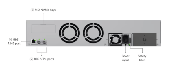 Obudowa została przystosowana do montażu w szafie Rack 19", wysokość wynosi 2U. Z uwagi na wagę (11,5 kg) UNAS Pro 8 należy zastosować korzystając z 4 szyn rack. W zestawie znajdziesz jeden moduł zasilający hot-swap AC o mocy 550 W, możesz dokupić dodatkowy w celu zapewnienia redundancji zasilania.