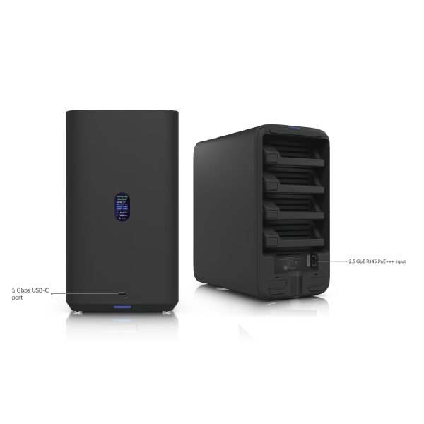 Wewnątrz obudowy możesz zamontować maksymalnie 4 dyski twarde HDD 2.5" / 3.5". Producent sugeruje stosowanie oryginalnych lub certyfikowanych dysków, listę certyfikowanych dysków znajdziesz na oficjalnej stronie Ubiquiti. Dodatkowo NAS posiada 2 sloty M.2 NVMe na dyski SSD, możesz skorzystać z SSD Cache. Serwer obsługuje RAID 5, RAID 6, RAID 10, co pozwala dodatkowo zabezpieczyć cały system przed awarią dysków.
