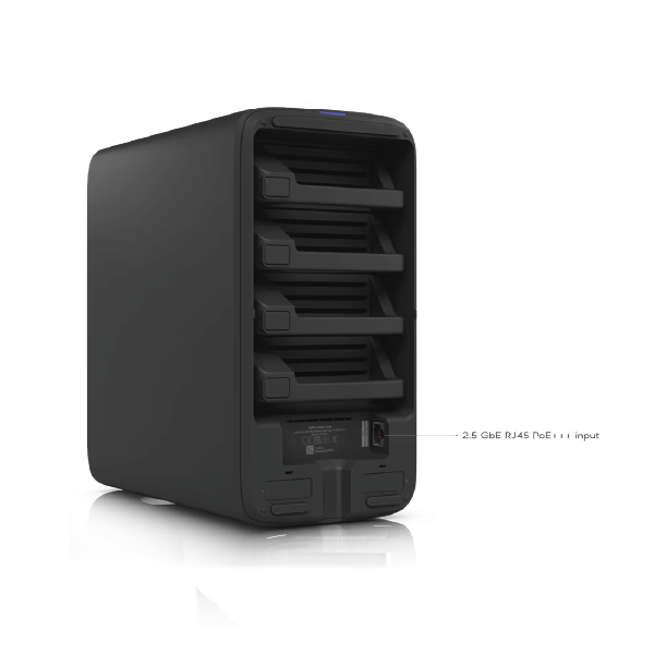 NAS posiada niewielką obudowę typu desktop, zasilanie możesz doprowadzić tylko przez port Ethernet korzystając z PoE+++ (802.3bt type 4). Odpowiedni zasilacz znajdziesz w zestawie, urządzenie możesz podłączyć również bezpośrednio do switcha obsługującego PoE+++.