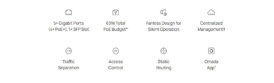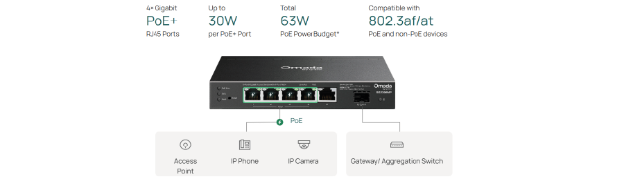 | Porty PoE (RJ45) | Zgodność ze standardami 802.3af/at Porty PoE+: 4 Porty Łączna moc zasilania PoE: 63 W* Fast PoE Perpetual PoE |
