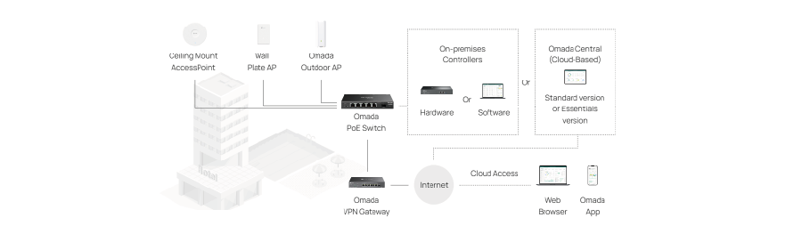 | Dostęp do chmury | Tak. Wymaga korzystania z Kontrolera sprzętowego Omada, Kontrolera Omada opartego na Chmurze lub Kontrolera programowego Omada. |