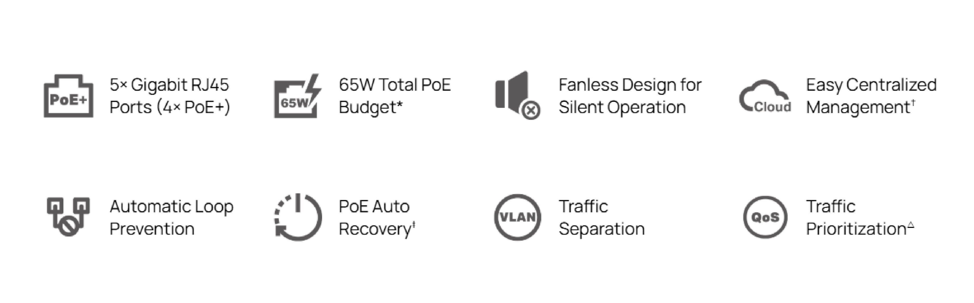 Porty     5 portów RJ45 10/100/1000 Mb/s (Porty 1-4 obsługują 802.3at PoE+ oraz 802.3af PoE)