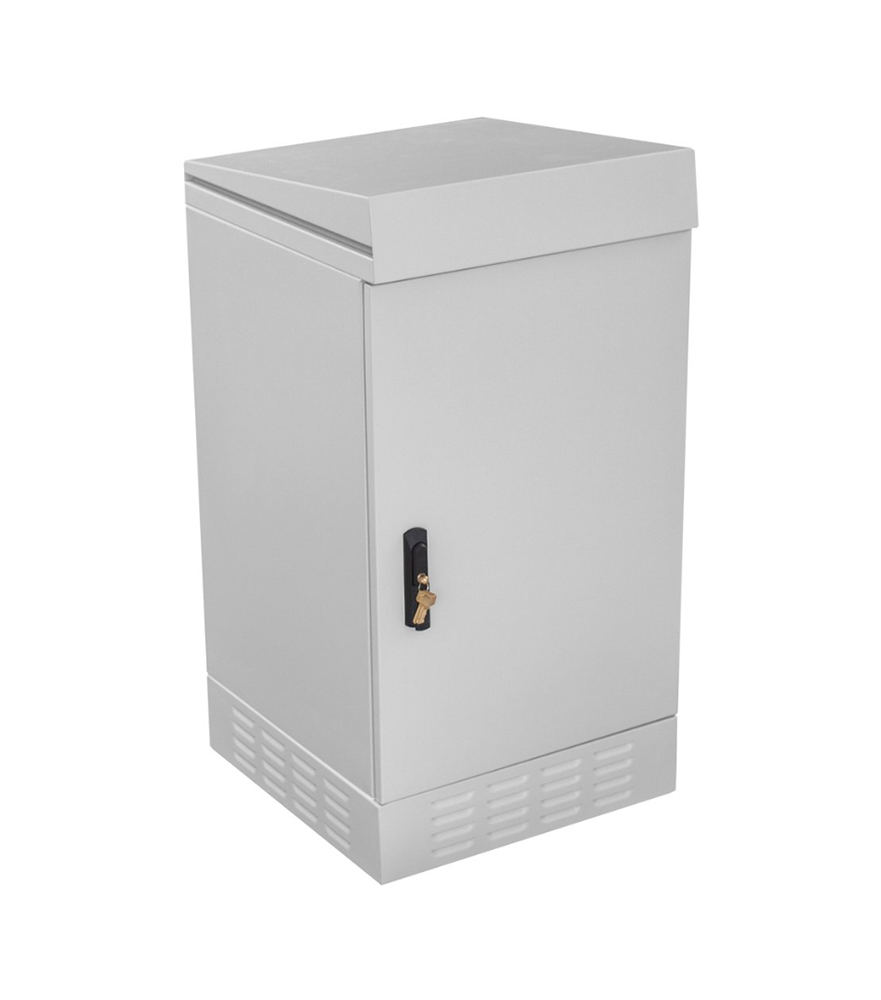 Szafa cechuje się stopniem ochrony IP54, jest przystosowana do wykorzystania na zewnątrz budynków. Konstrukcja jest zabezpieczona przed wnikaniem wody i pyłów. Jest to szafa wolnostojąca, możesz ją odpowiednio zakotwić do podłoża (np. betonowego), osadzić na studni telekomunikacyjnej lub na postumencie (sprzedawany osobno).