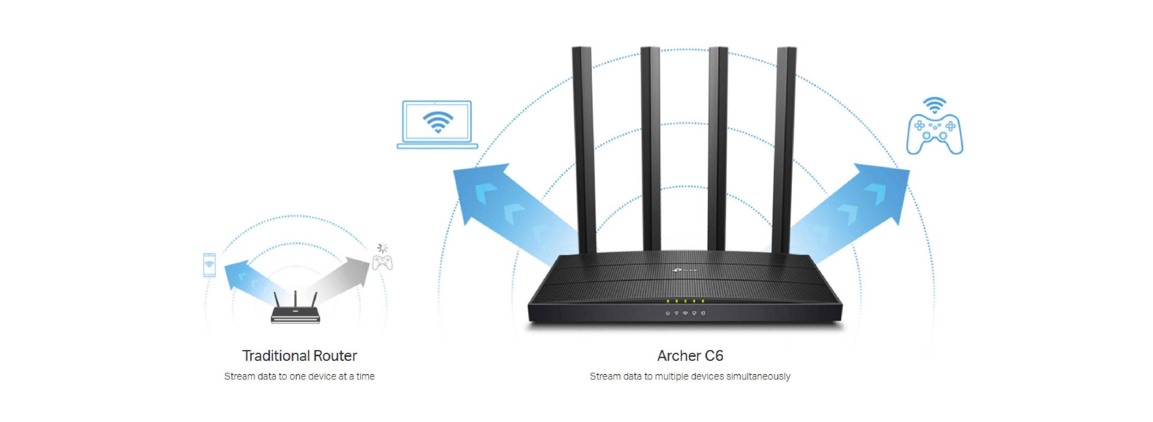 Dzięki technologii MU-MIMO, Archer C6 może wysyłać dane do kilku urządzeń jednocześnie. Nielimitowana rozrywka bez opóźnień na wszystkich urządzeniach staje się rzeczywistością. Wszystkie urządzenia otrzymują dane szybciej, a sieć Wi-Fi jest wykorzystywana bardziej efektywnie.