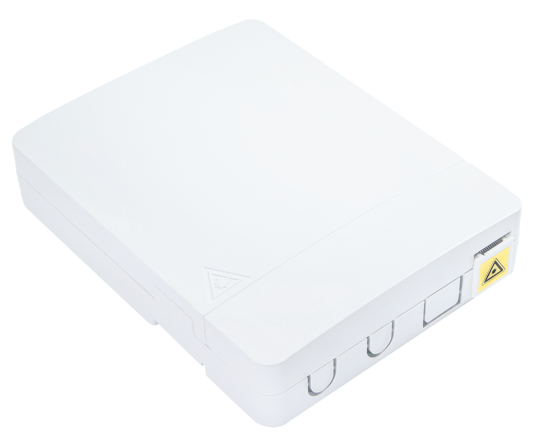 FTB-02D-SCA to domowa puszka zakończeniowa wyposażona w adapter i pigtail SC/APC (włókno G.652.D). Produkt montuje się naściennie, wewnątrz umieszczono tackę z miejscem na spawy i zapas kabla.