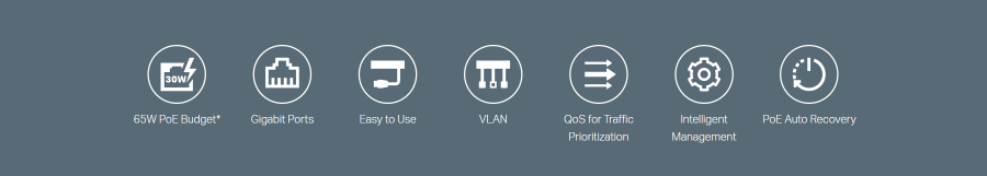 Zgodność ze standardami 802.3af/at PoE+ oznacza, że na każdym z portów PoE do dyspozycji jest nawet 30 W mocy. Aż 65 W łącznej mocy zasilania PoE* przełącznika wyposażonego w 4 gigabitowe porty PoE+ to rozwiązanie idealne m.in. dla systemów monitoringu, biur, akademików i małych firm. Urządzenie jest w pełni zgodne z kamerami IP, punktami dostępowymi, telefonami IP, komputerami, drukarkami, itd.