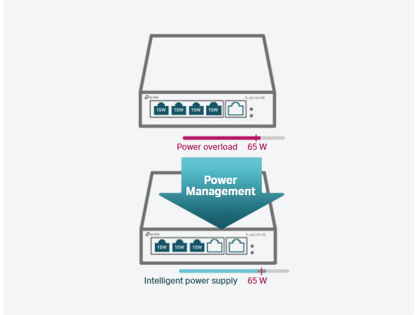 Gdy całkowity pobór mocy przekracza 65 W, funkcja inteligentnego zarządzania zużyciem energii wyłącza zasilanie portu o najniższym priorytecie, aby zapewnić zasilanie portów o wyższych priorytetach i tym samym chronić urządzenie przed przeciążeniem.