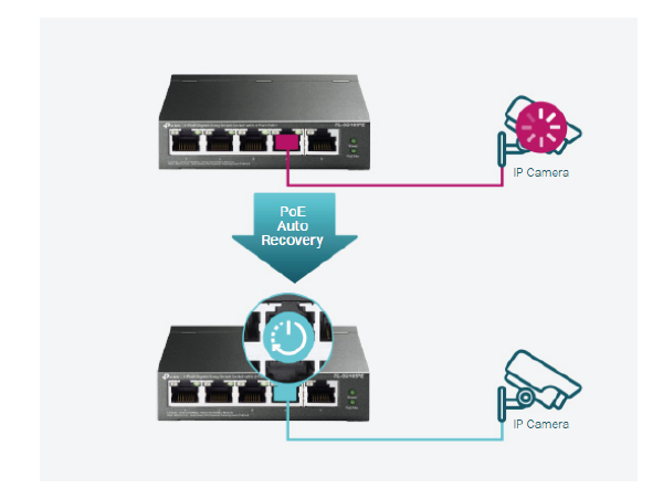 Przełącznik automatycznie wykrywa i ponownie uruchamia urządzenia z możliwością zasilania PoE, takie jak kamery i punkty dostępowe, gdy przestają działać lub reagować na żądania. Gwarantuje to stabilność ich działania bez potrzeby monitorowania ich pracy i ręcznego restartu.