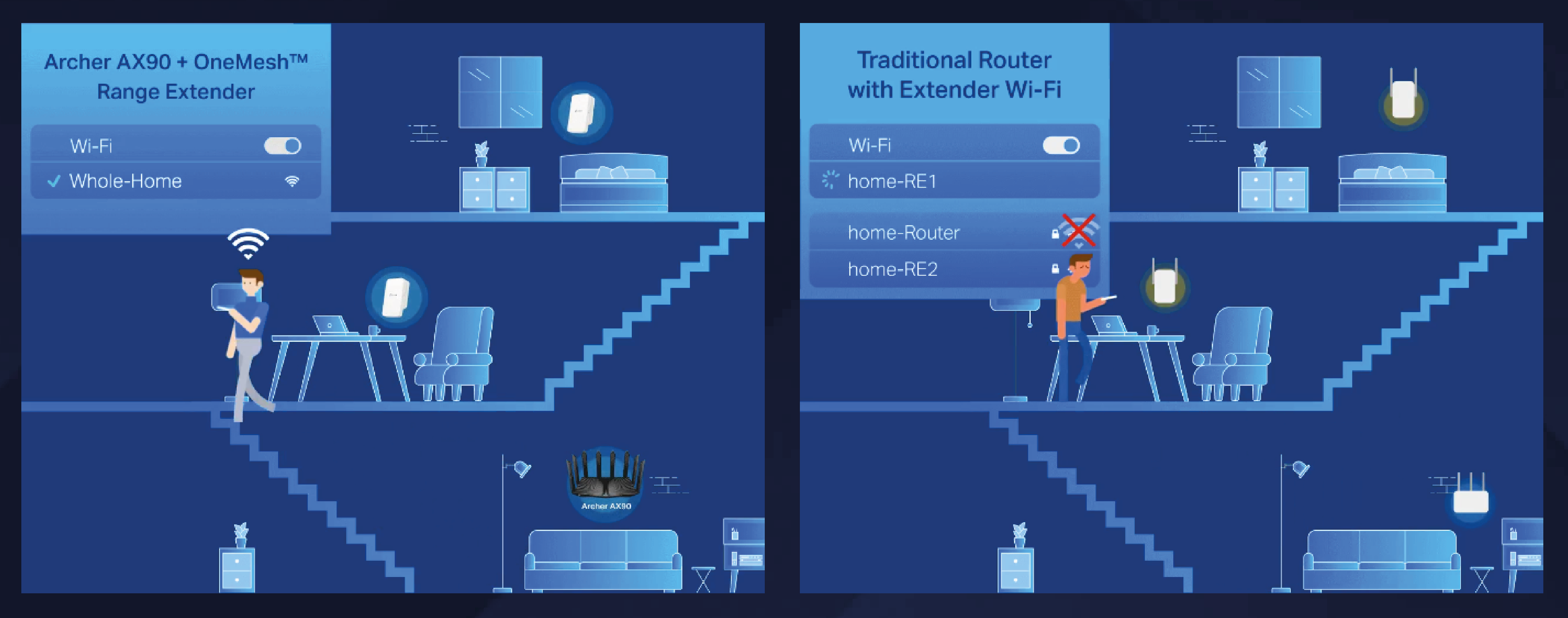 Technologia OneMesh™ to łatwy sposób na utworzenie jednolitej sieci mesh, obejmującej swoim zasięgiem całą powierzchnię domu. Wystarczy, że podłączysz wzmacniacz sygnału z technologią OneMesh™ do routera OneMesh™. Nie musisz już błądzić po domu w poszukiwaniu stabilnego połączenia!