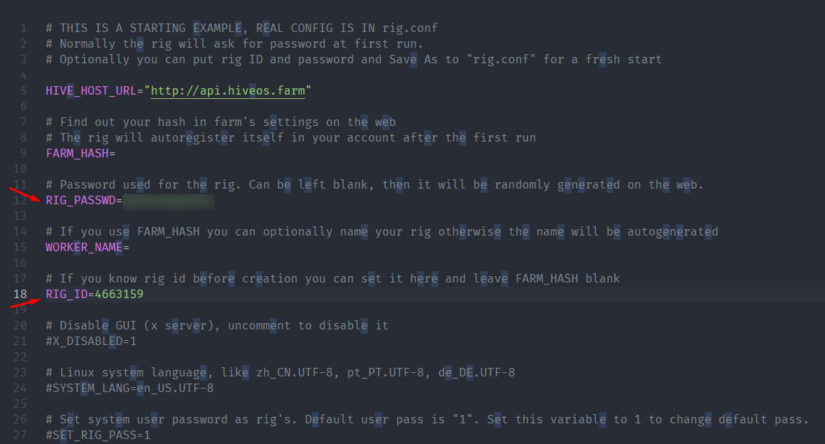 - Edytujemy plik rig.conf, wpisujemy nasze dane w odpowiednich miejscach (rig_id i hasło)