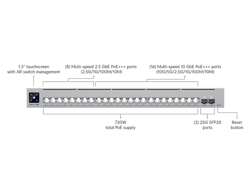 8 portów 2.5G Ethernet (10 / 100 / 1000 / 2500 Mb/s) z wyjściem PoE+++ 16 portów 10G Ethernet (10 / 100 / 1000 / 2500 / 5000 / 10000 Mb/s) z wyjściem PoE+++ 2 sloty SFP28 (1 / 10 / 25 Gb/s) |