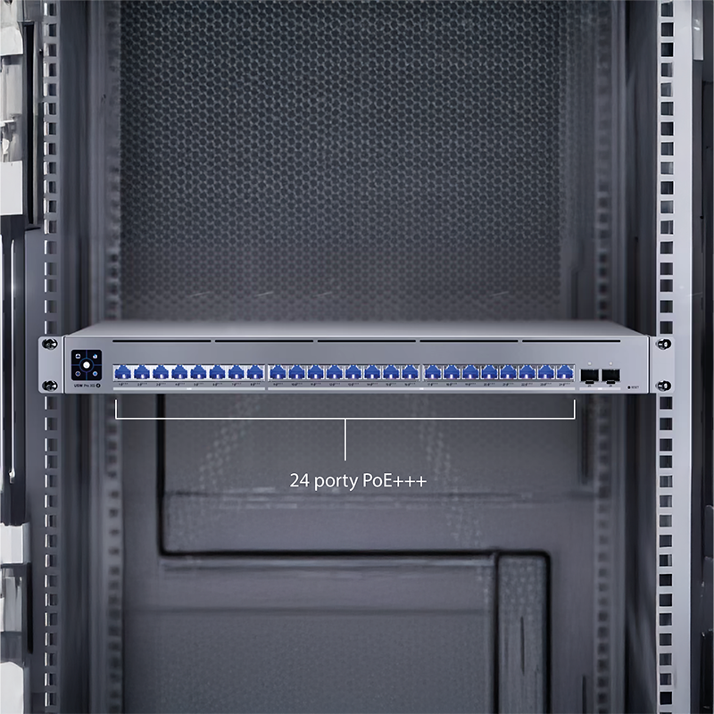 Ubiquiti Pro XG 24 PoE to zarządzalny switch przeznaczony do pracy pod kontrolą systemu UniFi. Wyróżnia się dużą przepustowością, został wyposażony w 16 portów 10G Ethernet, 8 portów 2.5G Ethernet oraz 2 sloty SFP28 (25 Gb/s). Na każdym porcie Ethernet znajduje się wyjście zasilania PoE+++, maksymalna moc wyjściowa na port wynosi, w zależności od standardu, 15,4 W przy PoE (802.3af), 30 W przy PoE+ (802.2at), 60 W przy PoE++ (802.3bt type3) lub 90 W przy PoE+++ (802.3bt type4). Łączny budżet mocy PoE na wszystkie porty wynosi 720 W. Pro XG 24 PoE obsługuje funkcję Etherlighting (możliwość podświetlania portów przy zastosowaniu odpowiednich patch cordów) oraz wybrane funkcje zarządzania Layer 3 - serwer DHCP, DHCP Relay, Inter-VLAN routing oraz statyczny routing. Oferowany produkt doskonale sprawdzi się w pracy jako switch dostępowy w sieciach opartych na punktach dostępowych Wi-Fi 7. Porty o wysokiej przepustowości pozwolą w pełni wykorzystać możliwości nowoczesnej generacji Wi-Fi, dodatkowo zasilanie PoE o dużej mocy umożliwi podłączenie większości AP UniFi, Switch został wyposażony w zintegrowany zasilacz AC o mocy 870 W, dodatkowo posiada złącze USP RPS DC pozwalające na podłączenie zasilania awaryjnego (złącze jest kompatybilne tylko z USP-RPS).