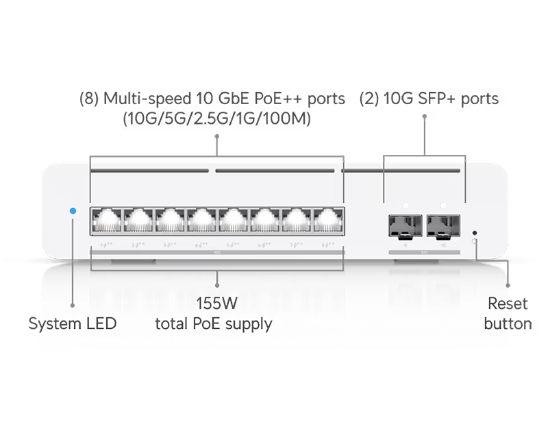 8 portów 10G Ethernet (100M / 1G / 2.5G / 5G / 10G) z wyjściem PoE++ 2 sloty SFP+ (1G / 10G) |