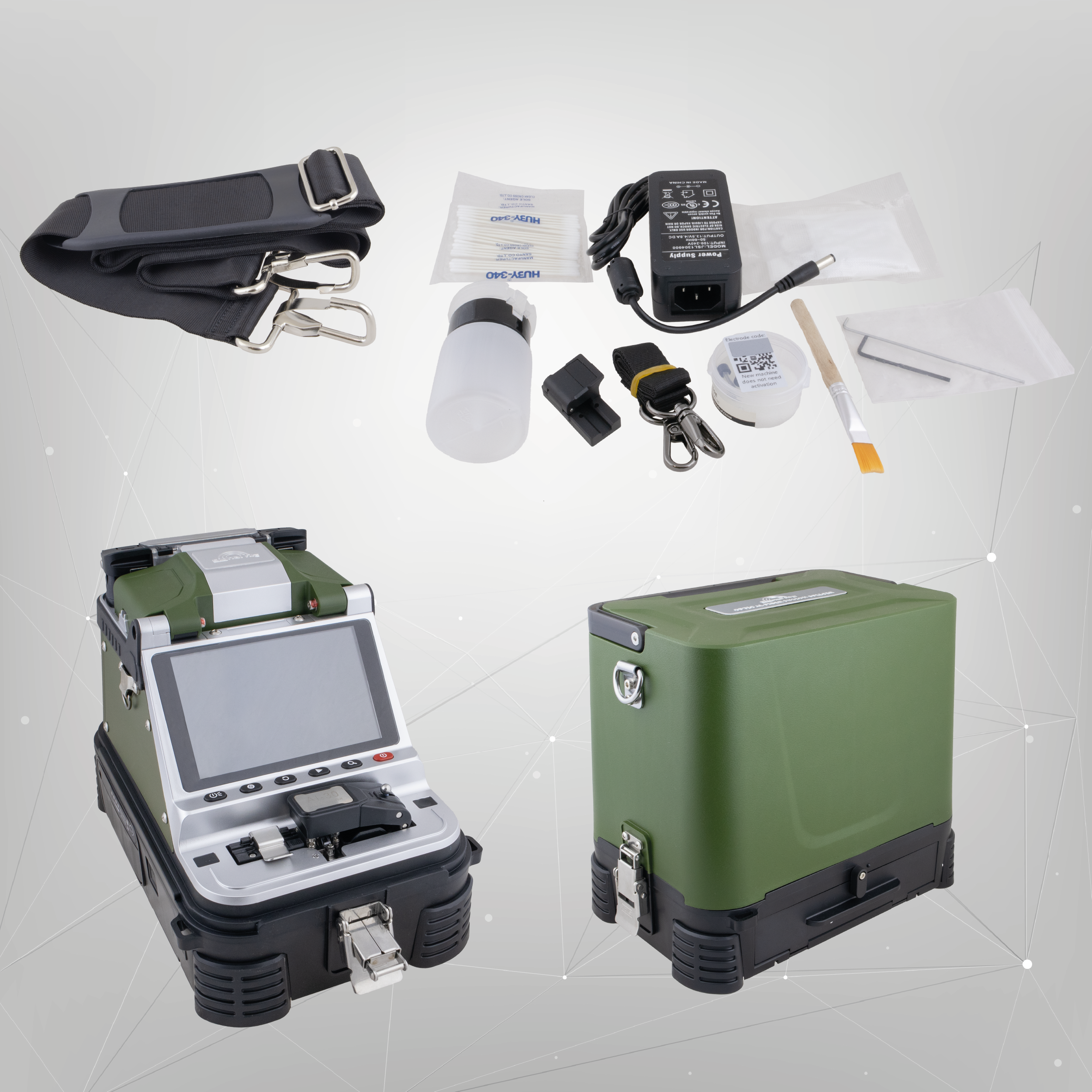 Oferowany produkt posiada zintegrowany nóż do cięcia włókien światłowodowych. Dzięki temu po ucięciu włókna możesz od razu, krótkim ruchem umieścić je w holderze. Dodatkowy atut stanowią wbudowany miernik mocy optycznej i wizualny lokalizator uszkodzeń. Miernik pozwala zmierzyć moc transmitowaną na danym odcinku, wspiera pomiar fal o długości 850, 1300, 1310, 1490, 1550 i 1625 nm. Wizualny lokalizator pozwoli ci sprawdzić uszkodzenia włókna na krótkim odcinku (moc 15 mW). W zestawie znajdziesz niezbędne akcesoria: akumulator 7800 mAh z ładowarką, dodatkowe elektrody, zaawansowany stripper, pędzelek oraz dozownik do alkoholu. Wszystko zamknięte zostało w poręcznej walizce, do której opcjonalnie możesz przypiąć pasek.