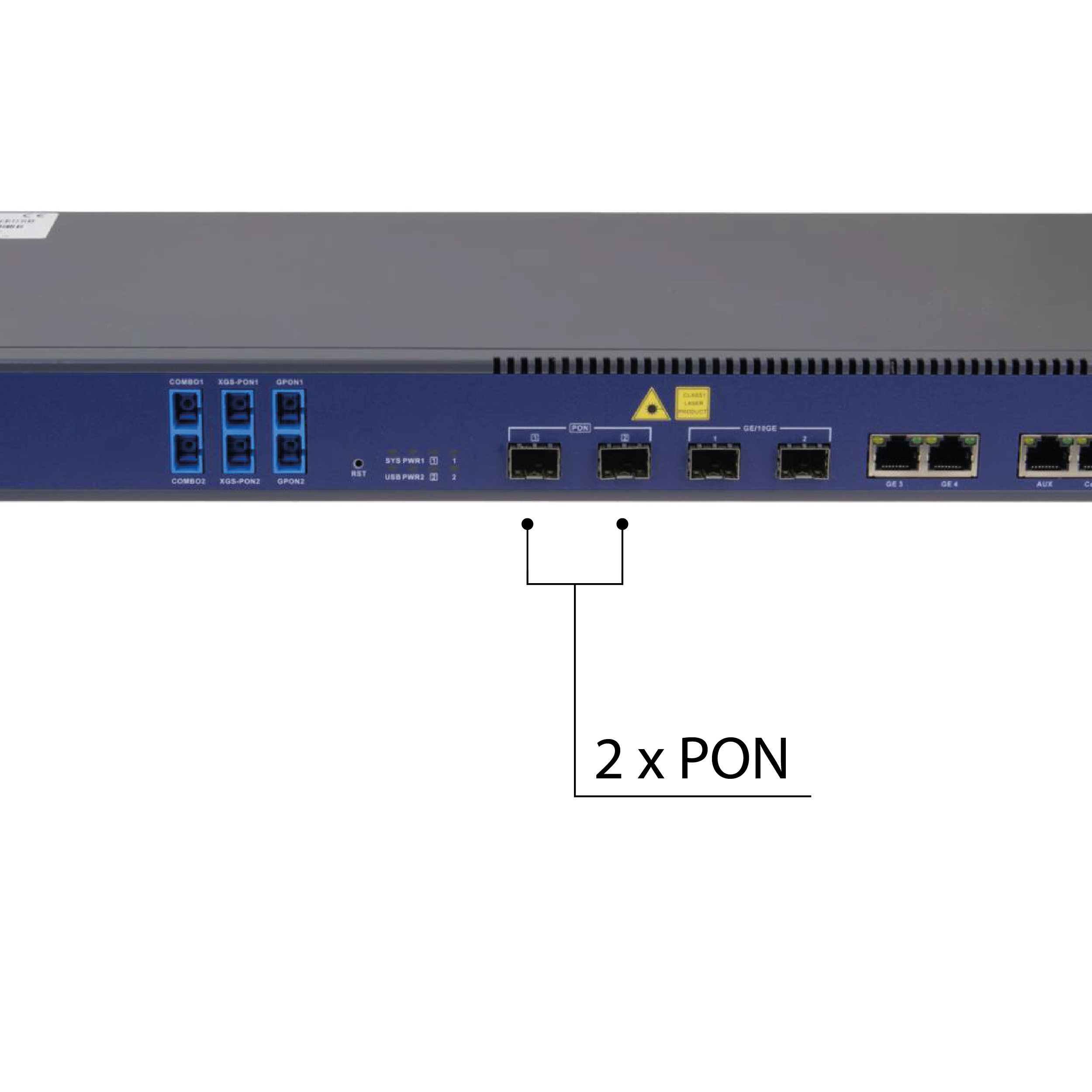Oferowany produkt to terminal OLT (nadawczy) wyposażony w dwa porty PON typu Combo. Prowadzona jest na nich jednocześnie transmisja XG-PON oraz XGS-PON. Dzięki temu podłączając abonentów możesz skorzystać z terminala ONT w jednej z dwóch technologii, zależnie od pakietu, jaki mu oferujesz. XG-PON umożliwia uzyskanie przepustowości 10 / 2,5 Gb/s (do / od klienta), a XGS-PON symetrycznie 10 / 10 Gb/s. Split wynosi 1:256, ale producent sugeruje korzystanie maksymalnie z 1:128. W zestawie znajdziesz odpowiednie wkładki PON.
