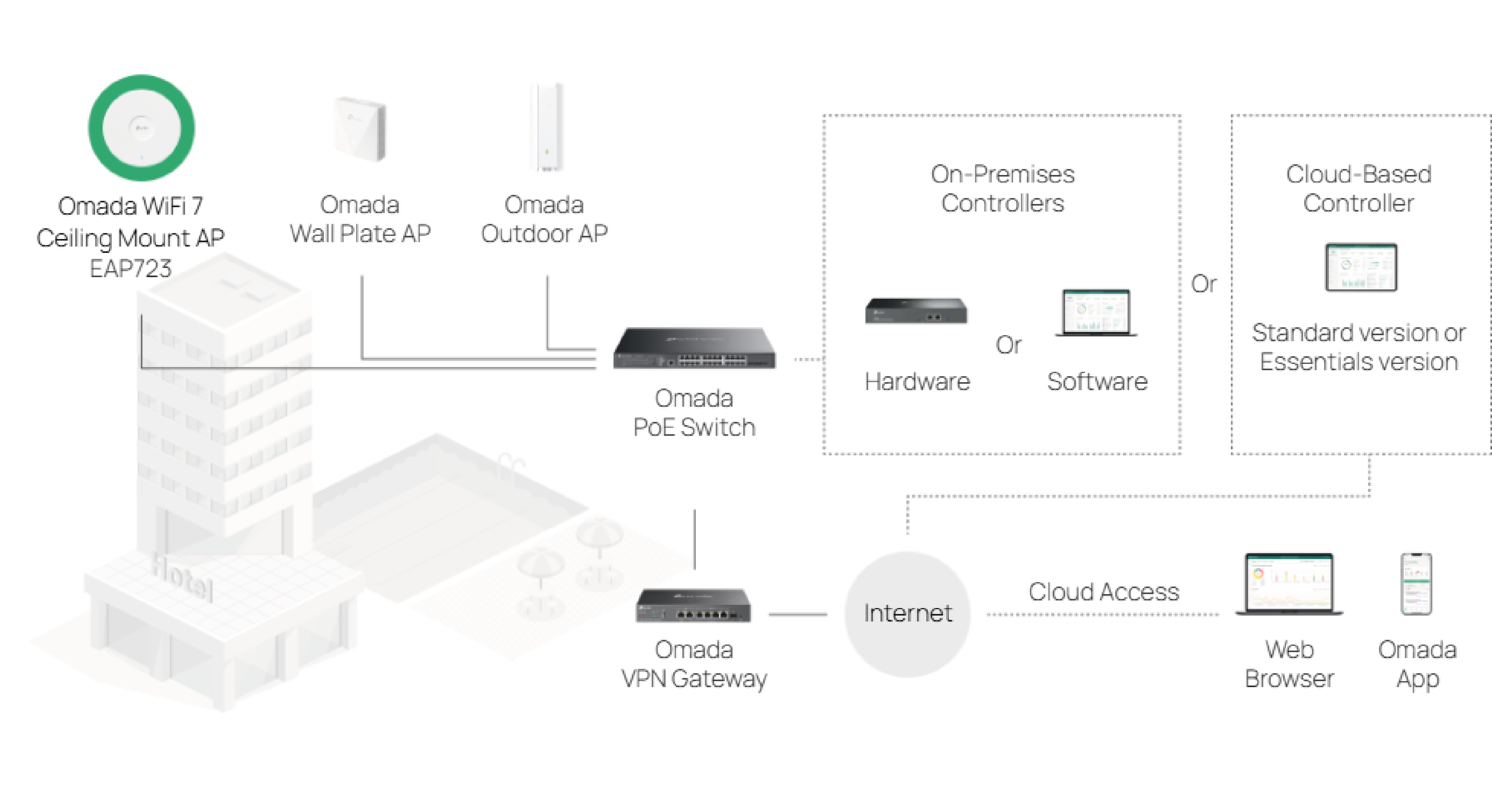 Scentralizowane zarządzanie | Kontroler Omada oparty na Chmurze Kontroler sprzętowy Omada Kontroler programowy Omada |