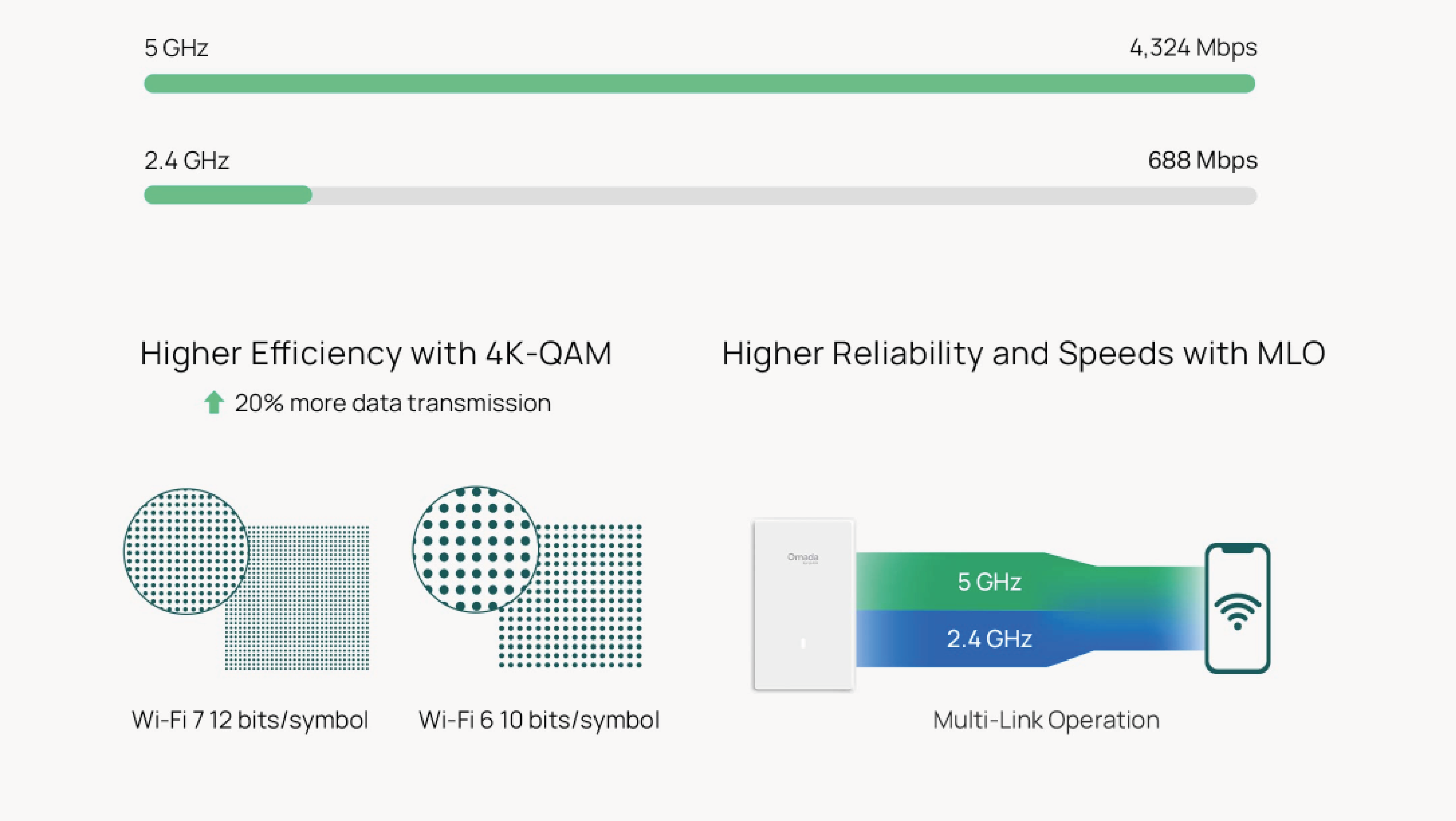 TP-Link EAP725-Wall to naścienny punkt dostępowy obsługujący najnowszy standard Wi-Fi 7 (IEEE 802.11be), działający jednocześnie w pasmach 2,4 i 5 GHz. Oferuje łączną przepustowość do 3600 Mb/s – do 688 Mb/s w paśmie 2,4 GHz oraz 2882 Mb/s w 5 GHz. Dzięki technologiom Wi-Fi 7, takim jak 320 MHz kanały, 4K-QAM, OFDMA oraz Multi-Link Operation (MLO), urządzenie zapewnia wysoką przepustowość, niskie opóźnienia i stabilne działanie w środowiskach z wieloma użytkownikami.