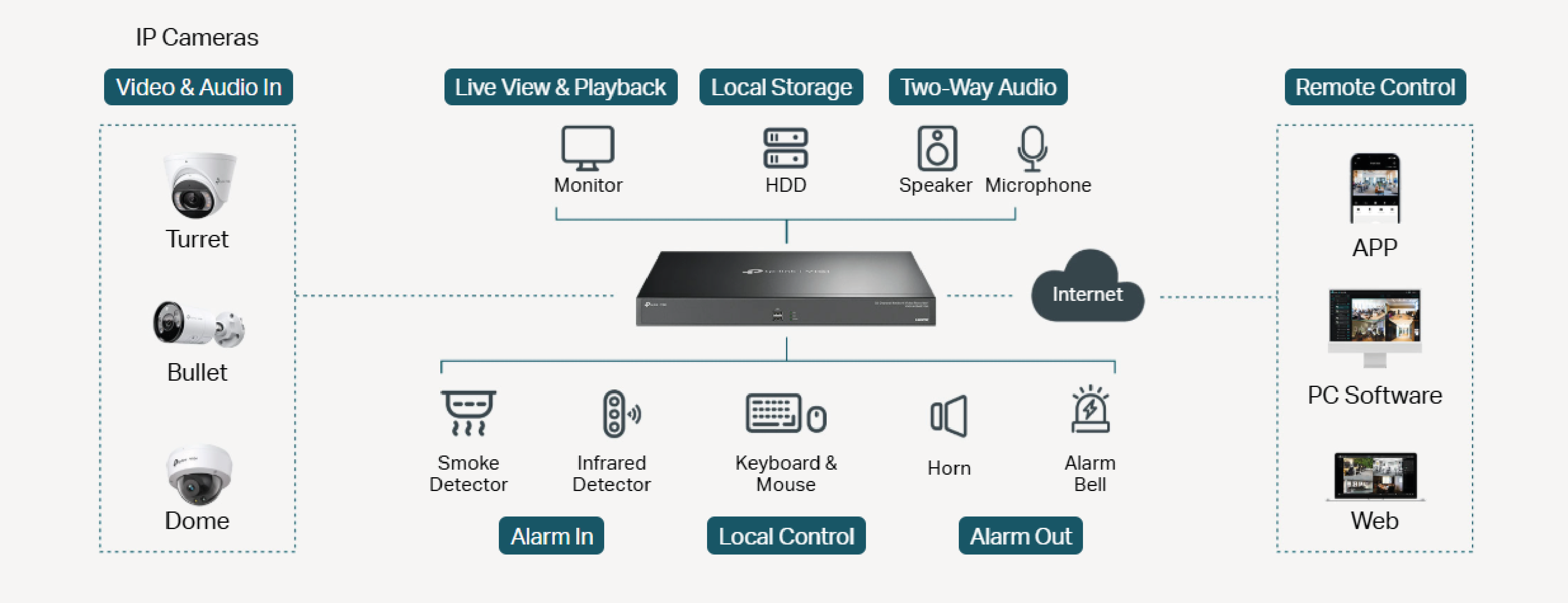 Ważnym atutem jest wsparcie H.265+ – nowoczesnego, wydajnego kodowania danych, które umożliwia zmniejszenie rozmiaru zapisywanych nagrań oraz bitrate'u. Rejestrator wspiera standard ONVIF, może być wykorzystywany również z kamerami innych producentów. Łączna obsługiwana przepustowość wynosi 320 Mb/s, co zapewnia wydajną obsługę 16 kamer o wysokiej rozdzielczości. Rejestratorem zarządza się z poziomu oprogramowania TP-Link VIGI, które jest dostępne na PC lub urządzenia mobilne.