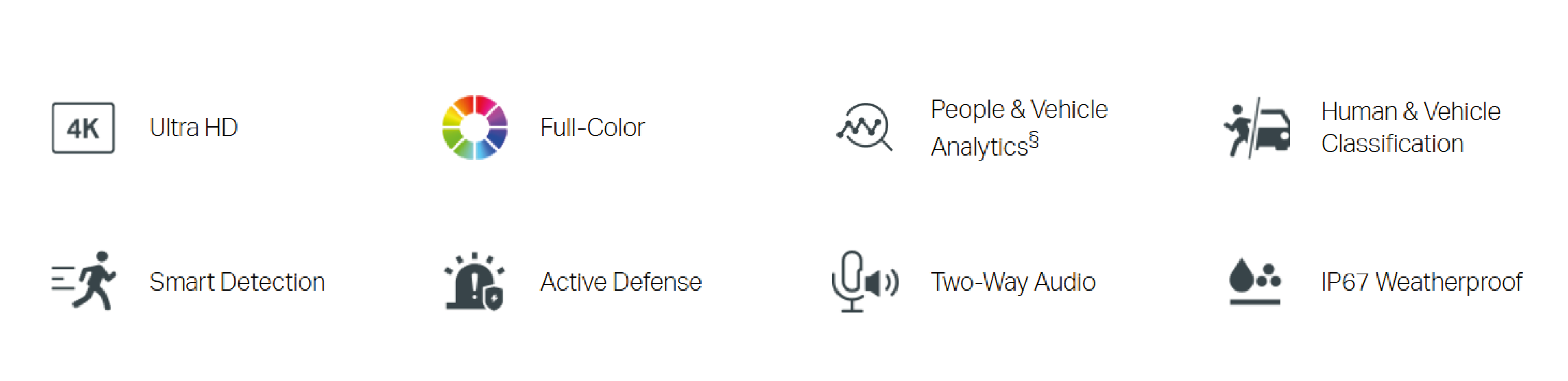 | Zdarzenia podstawowe | Wykrywanie ruchu (wspomagane przez Klasyfikację ludzi i pojazdów, w celu uzyskania dokładniejszych alertów) Wykrywanie manipulacji wideo Wyjątek (błędne logowanie) Wejście alarmowe urządzenia |