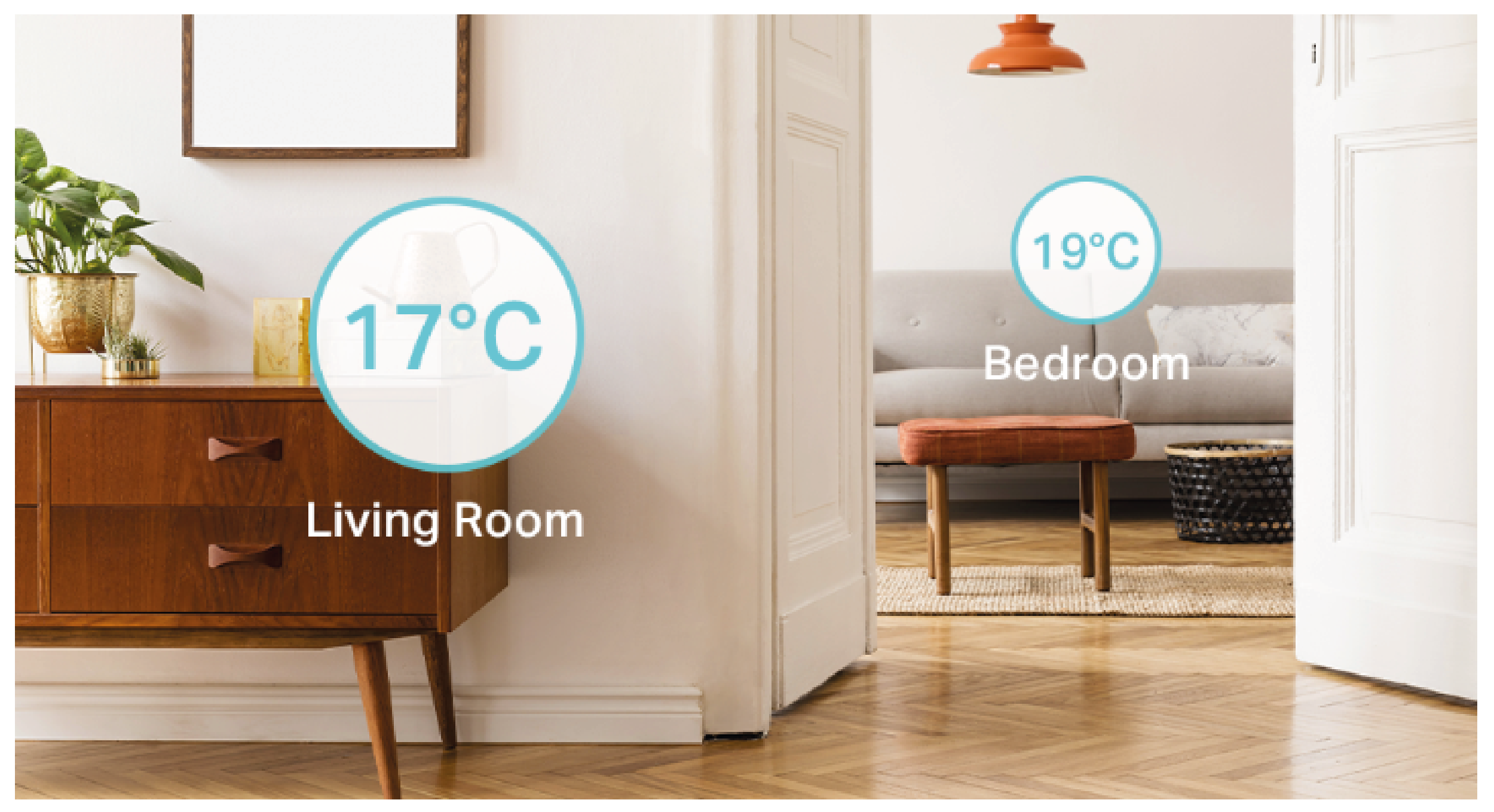 Wsparcie zewnętrznych czujników temperatury takich jak Tapo T310 i Tapo T315 umożliwia precyzyjną kontrolę temperatury w dowolnej częsci pokoju, poprzez automatyczną regulację zaworu termostatycznego na podstawie odczytów z tych czujników - nie tylko w pobliżu grzejnika.