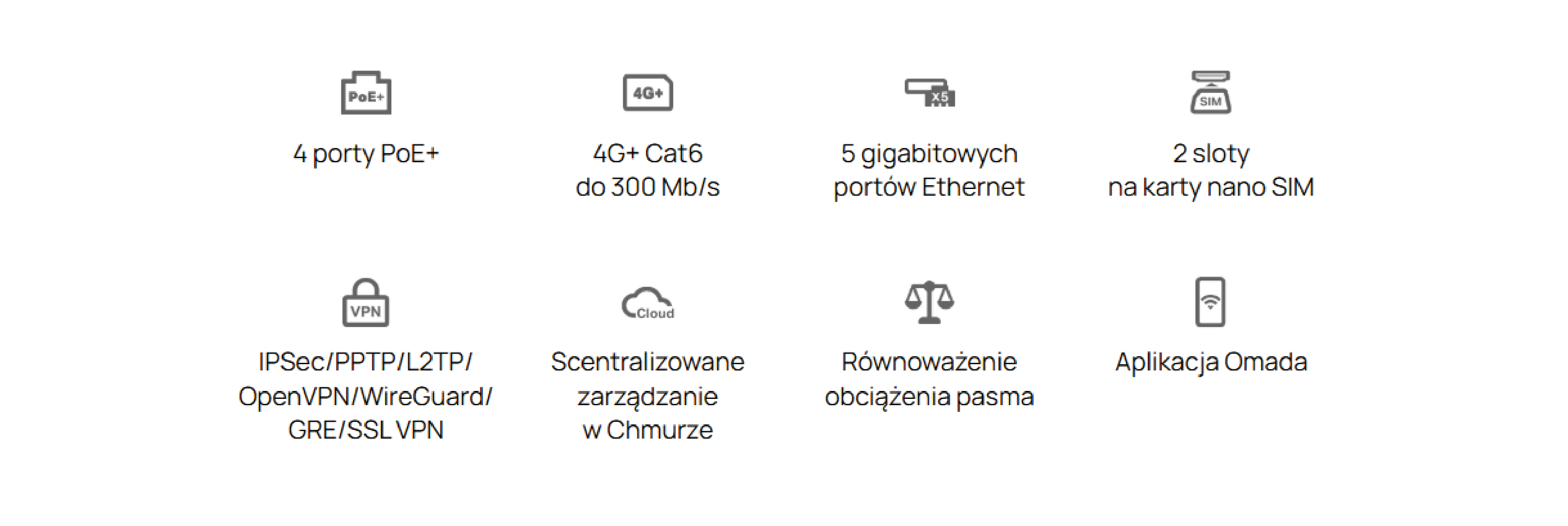 TP-Link ER706WP-4G to gigabitowa brama sieciowa VPN Omada z funkcjami routera, modemu 4G/LTE, punktu dostępowego Wi-Fi 6 i 4-portowego przełącznika PoE+. Urządzenie klasy AX3000 oferuje dwupasmowe Wi-Fi 6 z prędkościami do 2976 Mb/s. Łączność WAN zapewnia zintegrowany modem 4G+ Cat6 (do 300 Mb/s) z dwoma slotami SIM, dedykowany port WAN (RJ45) oraz jeden port SFP, a także możliwość rekonfiguracji czterech portów LAN/WAN (RJ45) z funkcją PoE+ (budżet 45W), wspierając tym samym pracę w trybie Multi-WAN. Brama sieciowa umożliwia bezpieczne połączenia dzięki protokołom IPsec, SSL, WireGuard, OpenVPN oraz jest w pełni zarządzana w ramach ekosystemu Omada SDN.