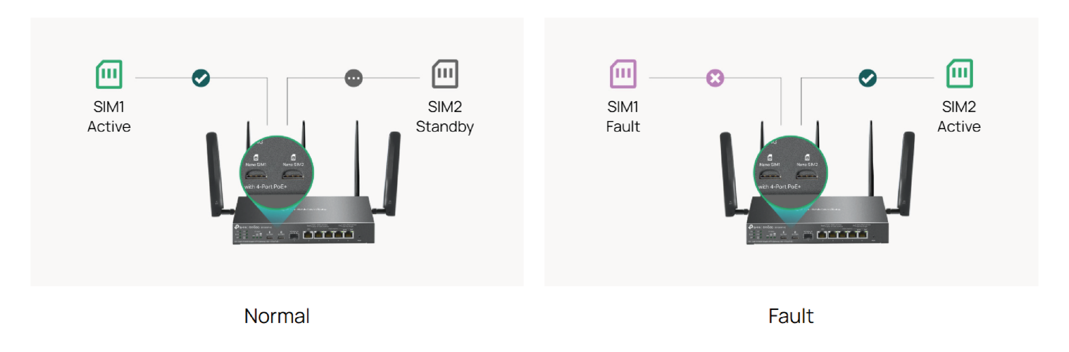 Dwa sloty na karty SIM zapewniają ciągłość pracy i redundancję nawet w scenariuszach gdzie zawiodą inne rezerwowe połączenia WAN.