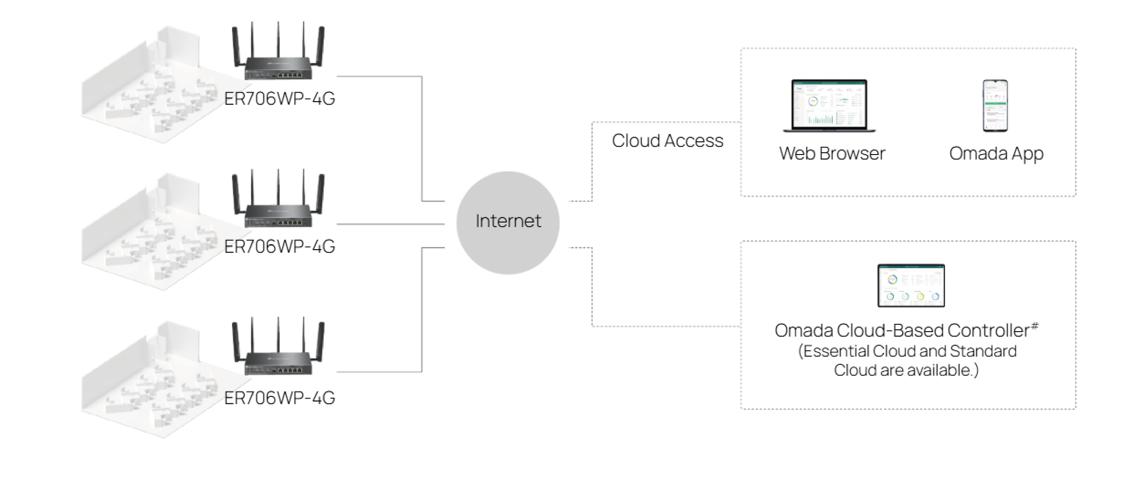 Scentralizowane zarządzenie w Chmurze dla Bram sieciowych Omada, Przełączników i Punktów dostępowych znajdujących się w wielu lokacjach, dzięki kontrolerowi Omada opartemu na Chmurze, oferującemu bezpłatną wersję Essentials usług chmurowych oraz obniżającemu koszty konserwacji.