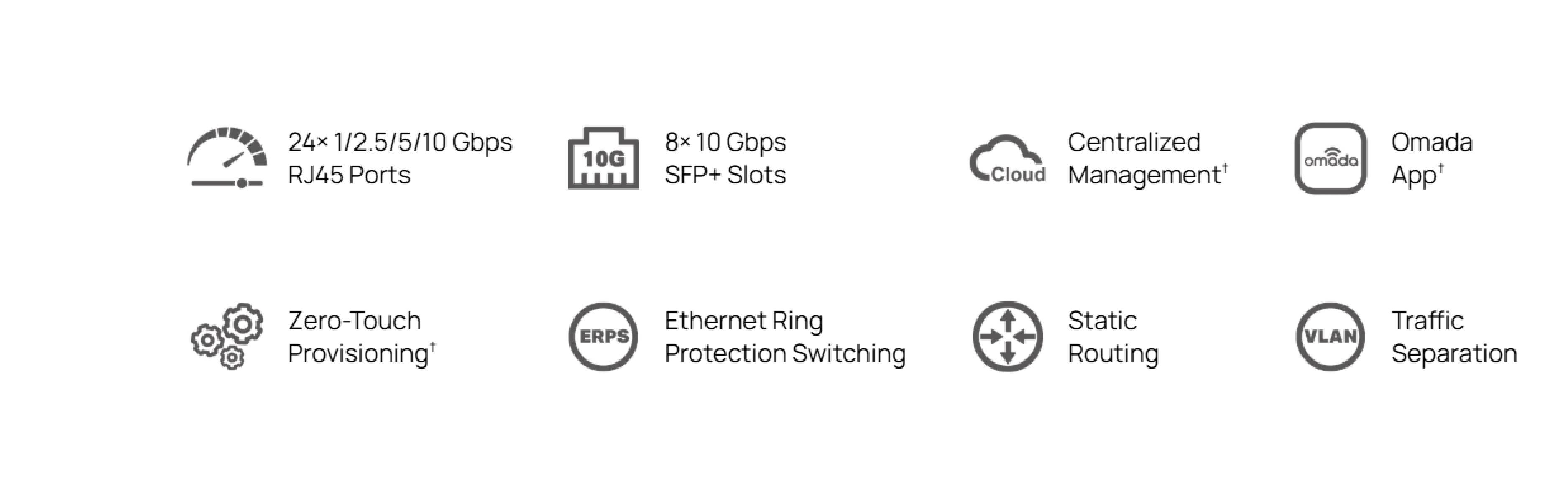 SX3832 to profesjonalny, zarządzalny przełącznik agregujący warstwy L2+, w pełni kompatybilny z systemem Omada SDN. Jest to urządzenie stackowalne, przeznaczone do pracy jako element dystrybucyjny lub szkieletowy w rozbudowanych, wymagających sieciach. Przełącznik oferuje 24 porty 10GBASE-T (RJ45, z obsługą Multi-Gig 10G/5G/2.5G/1G) oraz 8 slotów SFP+ 10GE do ultraszybkich połączeń światłowodowych, agregacji i stackowania. Należy zaznaczyć, że model SX3832 nie obsługuje zasilania Power over Ethernet (PoE).