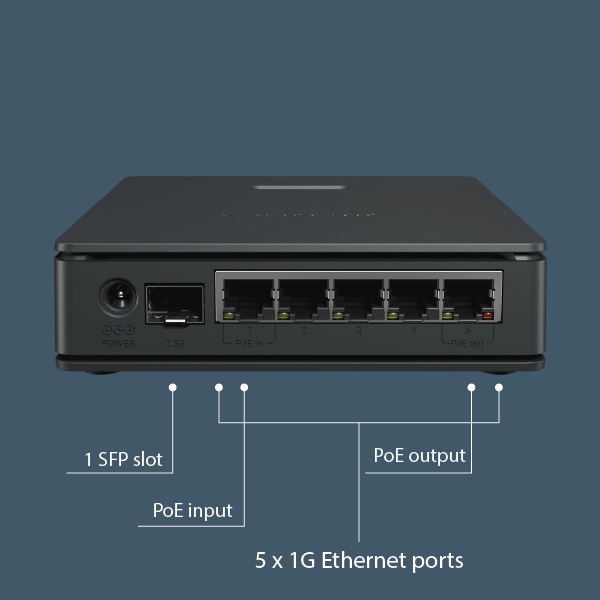 5 portów 1G Ethernet, 1 slot SFP, wejście i wyjście PoE