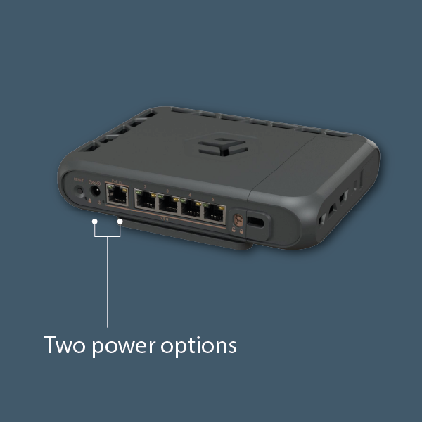 Router został wyposażony w obudowę typu desktop, w zestawie znajdziesz podstawkę pozwalającą postawić urządzenie pionowo. Zasilanie możesz doprowadzić korzystając z gniazda DC (napięcie 24 - 57 V DC) lub wejścia PoE (pasywne PoE / 802.3af/at, napięcie 24 - 57 V DC). W zestawie znajdziesz standardowy zasilacz 24 V / 1,5 A. Maksymalny pobór mocy samego urządzenia wynosi 20 W, a łączny maksymalny pobór mocy to 29 W.