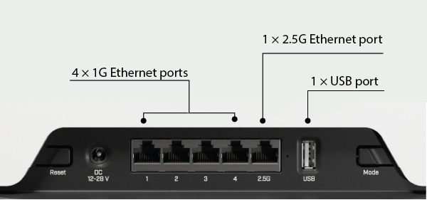 1 port 2.5G Ethernet, 4 porty 1G Ethernet, 1 port USB