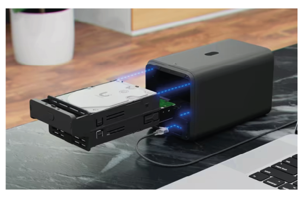 NAS posiada niewielką obudowę typu desktop, zasilanie możesz doprowadzić tylko przez port Ethernet korzystając z PoE++ (802.3bt). Odpowiedni zasilacz znajdziesz w zestawie, urządzenie możesz podłączyć również bezpośrednio do switcha obsługującego PoE++.