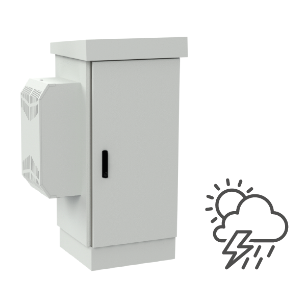 Dzięki zastosowaniu klimatyzatora szafa nie posiada otworów wentylacyjnych w dolnej części (w przeciwieństwie do standardowych, zewnętrznych szaf wolnostojących) co przekłada się na stopień ochrony IP65, a więc wyższy niż w szafach bez klimatyzacji (IP54). Konstrukcja została zabezpieczona przed wnikaniem wody i pyłów. Jest to szafa wolnostojąca, możesz ją odpowiednio zakotwić do podłoża (np. betonowego) osadzić na studni telekomunikacyjnej lub na postumencie (sprzedawany osobno).