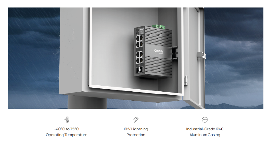 Przemysłowy przełącznik zarządzalny IES208G integruje się z systemem Omada SDN i oferuje osiem portów Gigabit RJ45 zapewniających stabilną transmisję danych w sieciach lokalnych. Urządzenie posiada metalową obudowę o klasie szczelności IP30 przystosowaną do montażu na szynie DIN i pracuje pasywnie w szerokim zakresie temperatur od -40°C do 75°C. Jednostka zapewnia wysoką niezawodność dzięki redundantnym wejściom zasilania DC oraz obsługuje zaawansowane funkcje warstwy drugiej, w tym segmentację ruchu VLAN, priorytetyzację QoS oraz protokoły eliminacji pętli STP. Zarządzanie realizowane jest centralnie przez platformę Omada lub za pomocą lokalnego interfejsu GUI, co czyni switch idealnym rozwiązaniem do pracy w wymagających środowiskach przemysłowych oraz systemach automatyki budynkowej.