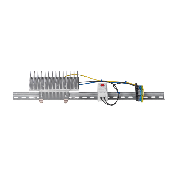 Oferowany produkt to zestaw grzejny dedykowany do szaf Rack 10"/19". Termostat służy do wyłączenia grzałki w momencie, w którym temperatura wewnątrz przekroczy zadaną. Moc zestawu wynosi około 50 W, napięcie wejściowe to 230 V AC. Wraz z produktem otrzymujesz szynę montażową TH35. Producent zaleca montaż w dolnej części szafy.